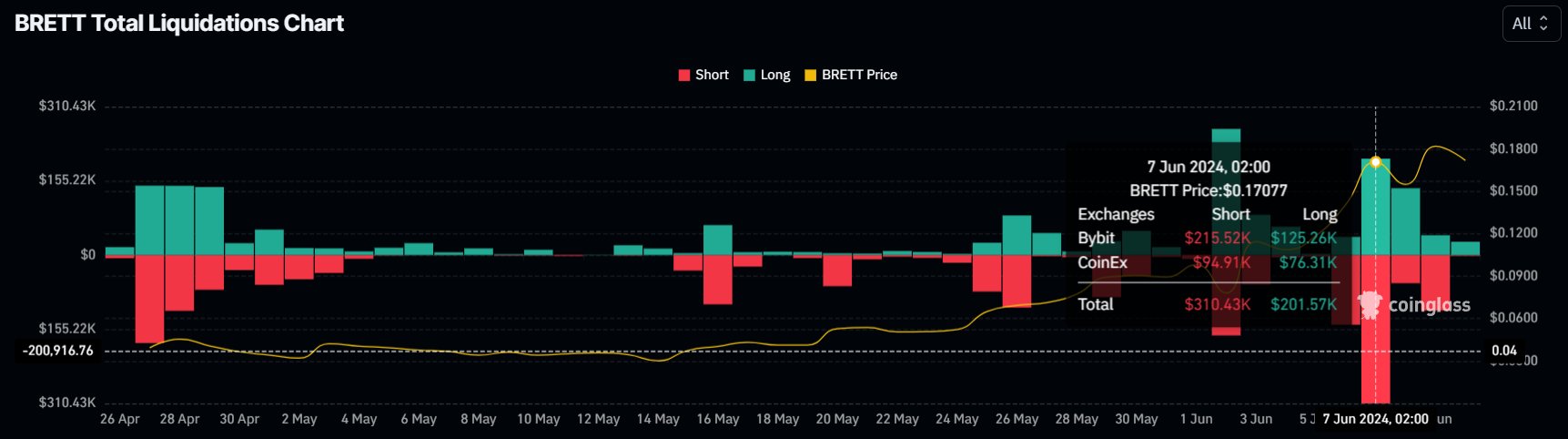Vì BRETT đã được mua quá mức, một khu vực thường đi kèm với các điều chỉnh, nên sẽ là không ngạc nhiên nếu chúng ta thấy giá giảm trong những ngày tới. Điều này càng có khả năng xảy ra vì các nhà giao dịch tiền điện tử đang mong đợi giá sẽ giảm. Tâm lý này có thể được quan sát qua các vụ thanh lý trên mạng. Hơn 840,000 USD giá trị hợp đồng bán khống đã được thanh lý trong 10 ngày qua. Số lượng lớn các hợp đồng bán khống hiện đang mở trên thị trường tương lai cũng là bằng chứng cho thấy điều này.