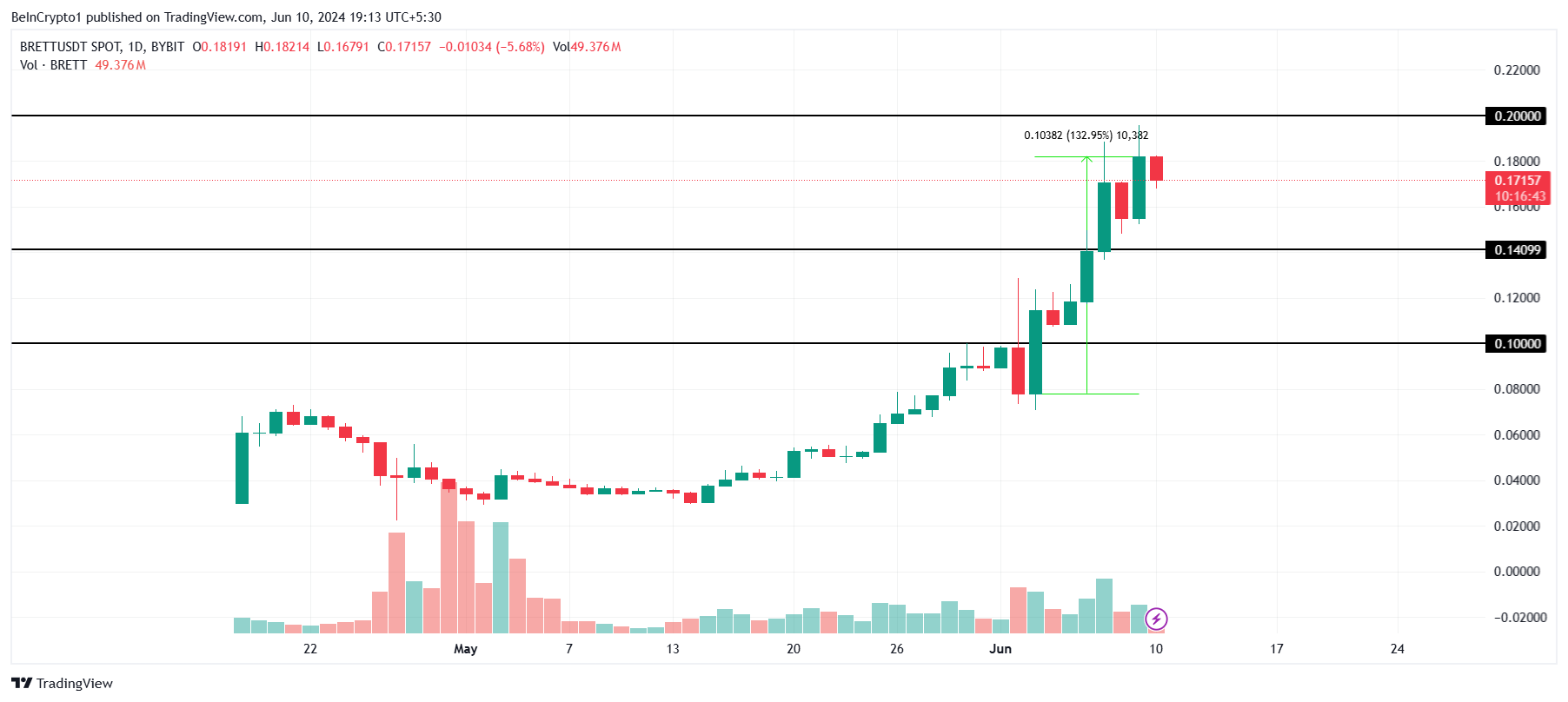 Giá của BRETT đã tăng vọt 113% trong bốn ngày qua, đưa giá trị của token lên 0.18 USD. Meme coin này hiện chỉ cách mốc 0.20 USD một chút nữa, điều này sẽ tạo ra một đỉnh cao mới cho tài sản này.