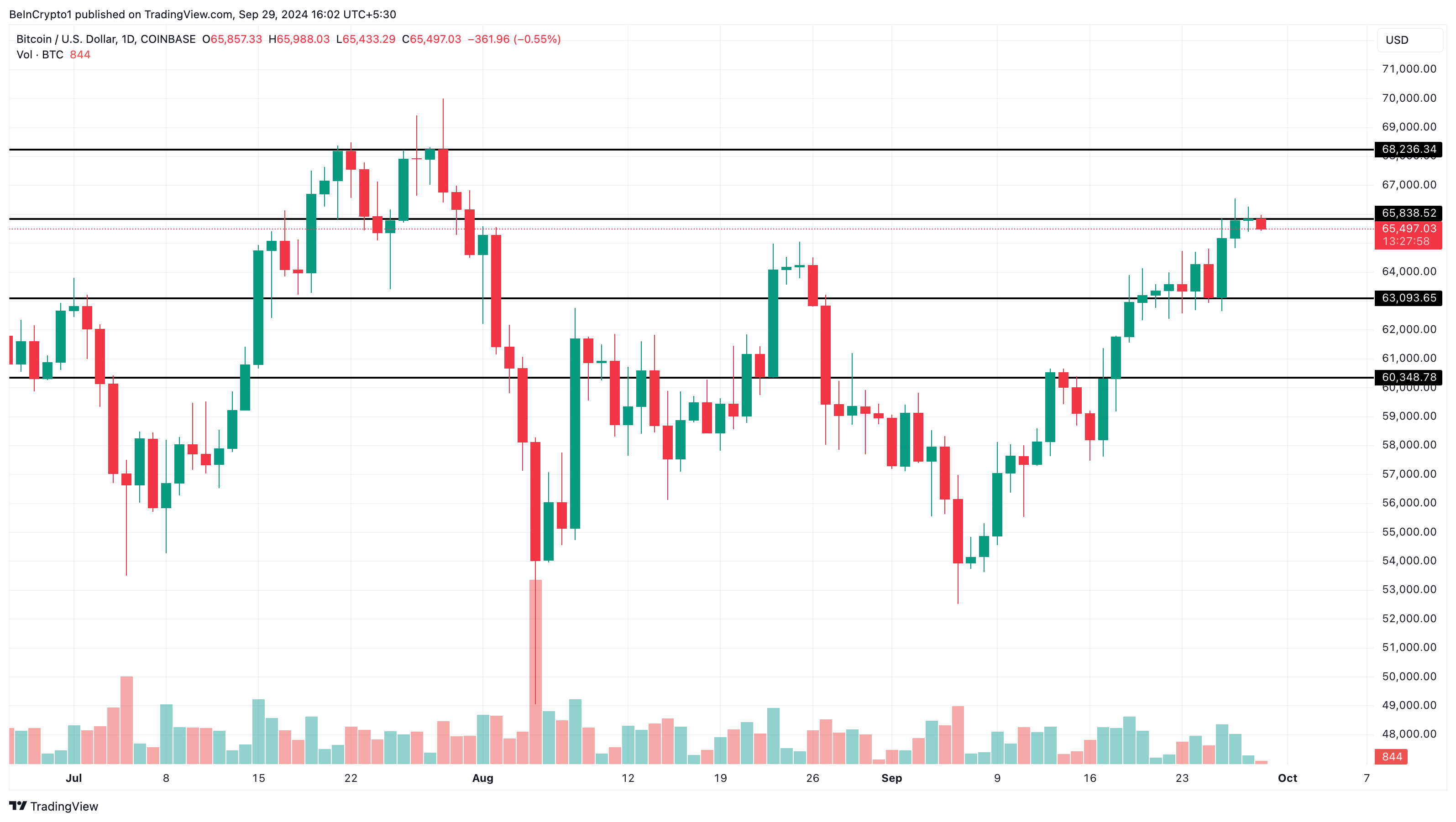Mặc dù giá dự kiến sẽ mang lại lợi nhuận tích cực, biểu đồ hàng ngày cho thấy nỗ lực của Bitcoin để đạt 69,000 USD đã gặp trở ngại. Điều này cho thấy gấu đang cố gắng lật đổ sự thống trị của bò. Nếu giá giảm xuống dưới 65,000 USD, khu vực 65,838 USD sẽ là một vùng kháng cự chính. Tuy nhiên, người mua có thể sẽ cố gắng bảo vệ BTC không để giảm xuống dưới mức hỗ trợ 63,093 USD. Biểu đồ dưới đây cho thấy khả năng phòng thủ này có thể thất bại.