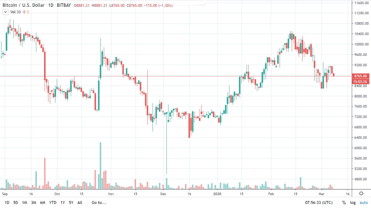 Nhưng nhìn chung, tâm lý của các nhà giao dịch vẫn là rất thận trọng. Trong ngày giao dịch hôm qua (7/3), giá BTC đã giảm xuống dưới 9.000 USD. Xu hướng giảm vẫn còn tiếp tục trong ngày hôm nay.