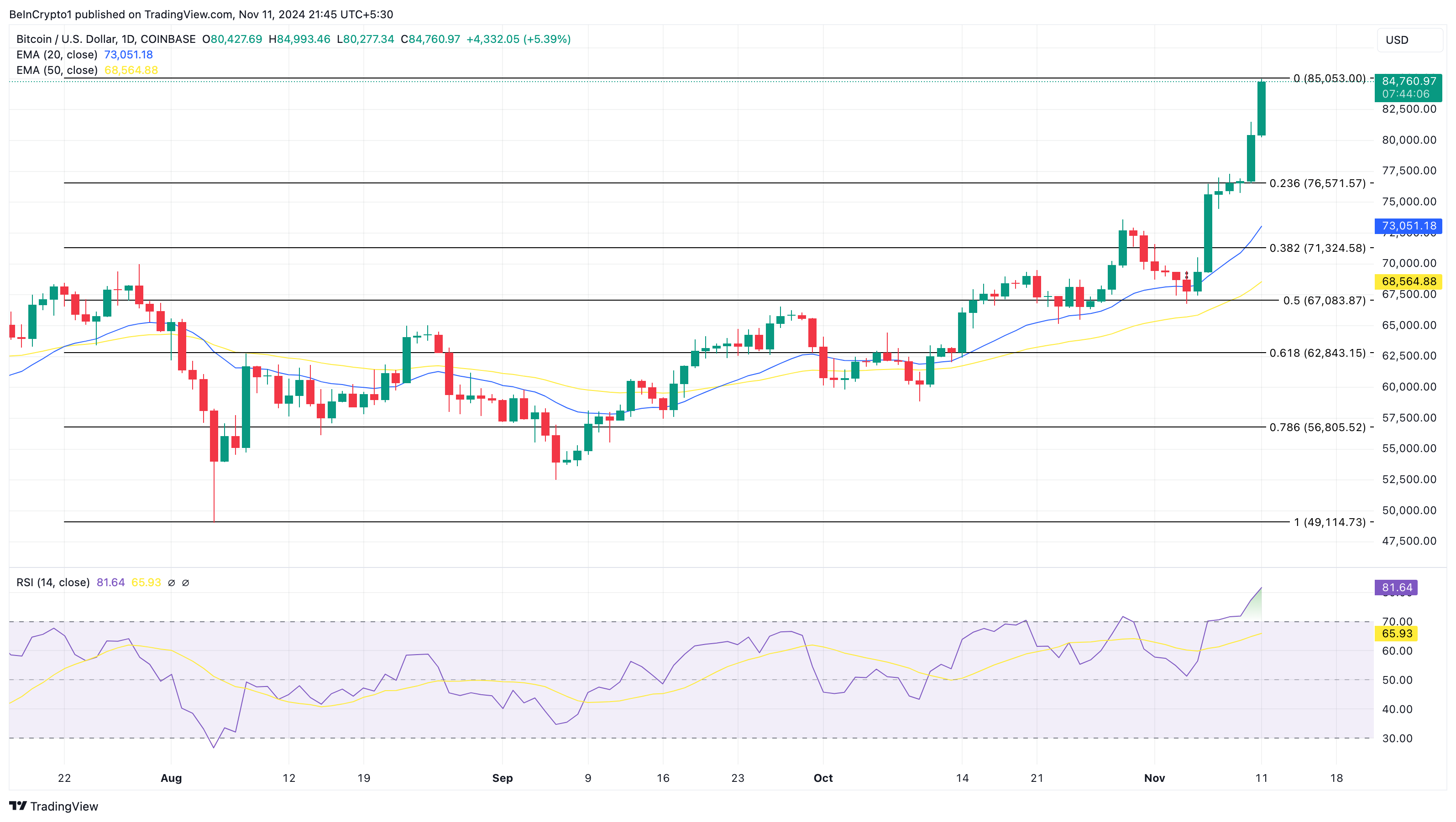 Hiện tại, Bitcoin đang có giá 84,760 USD, và biểu đồ hàng ngày cho thấy đồng tiền mã hóa này đang giao dịch trên cả đường trung bình động mũ (EMA) 20 ngày và 50 ngày. Việc ở trên những mức này cho thấy xu hướng của Bitcoin đang là tăng giá.