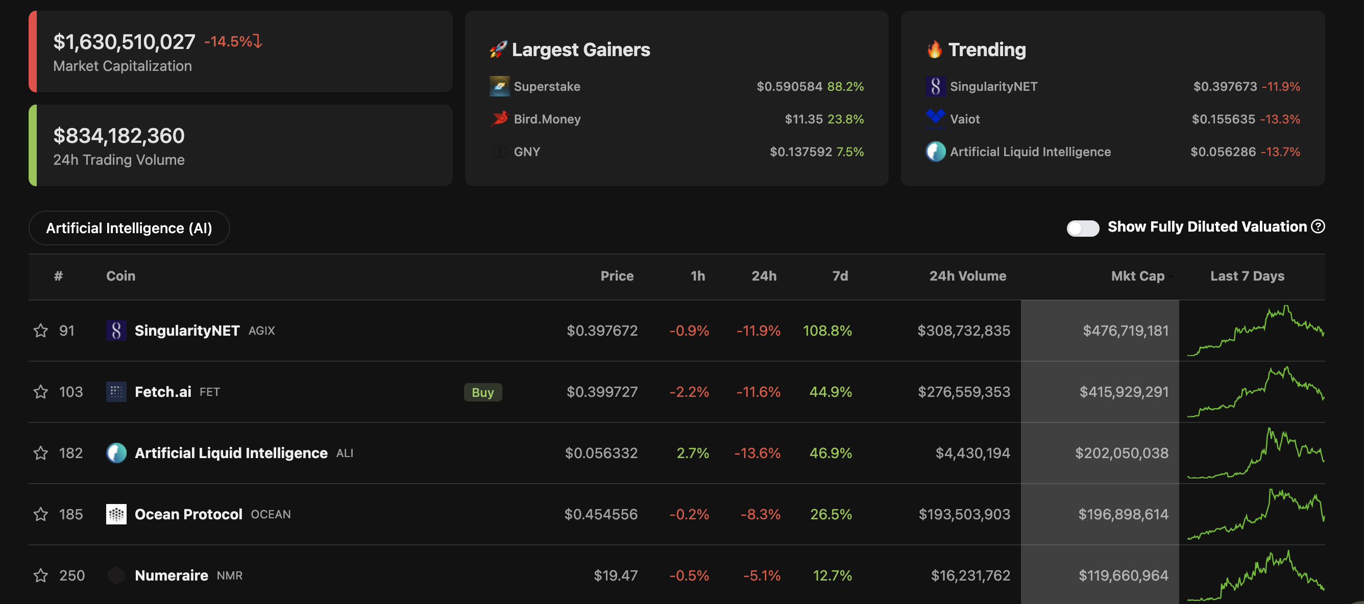 SponsoredNếu như 2 ngày trước đây, vốn hoá của nhóm đồng coin hệ AI rơi vào ngưỡng 2.19 tỷ USD với khối lượng giao dịch trong 24 giờ gần nhất là khoảng 1.2 tỷ USD thì tại thời điểm viết bài, vốn hoá của nhóm coin này đã bị thổi bay khoảng 600 triệu USD, lùi về mức 1.6 tỷ USD, ghi nhận mức giảm lên đến 14.5% trong 24 giờ qua. Khối lượng giao dịch cũng sụt giảm nặng nề khi ghi nhận chỉ có khoảng 834 triệu USD.