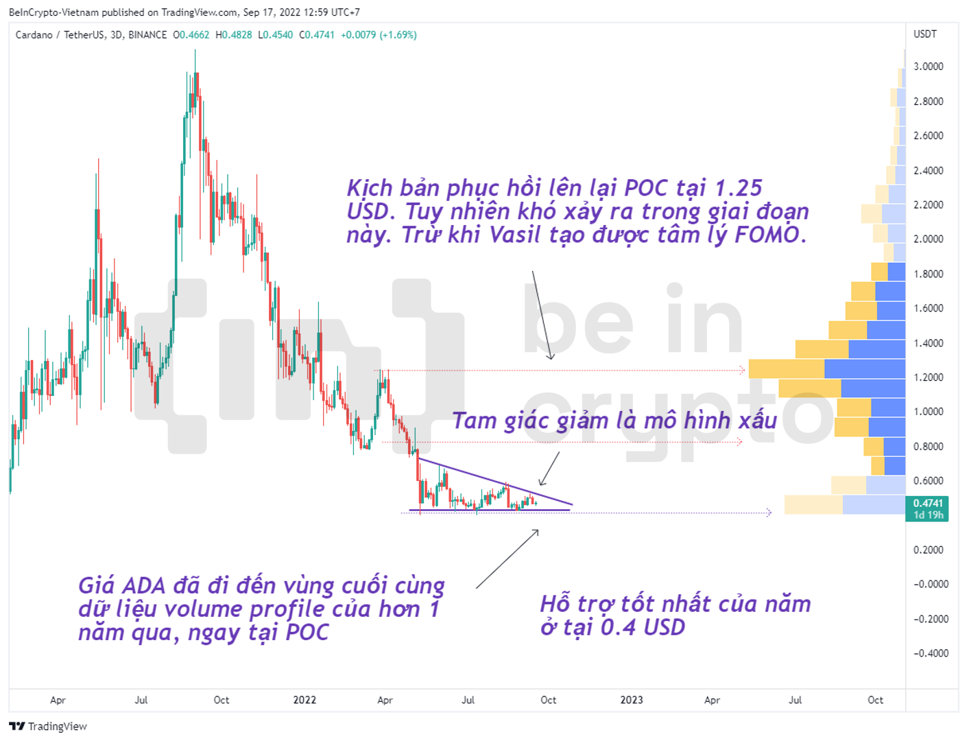 - Lý do thứ nhất, đây là vùng giá đánh dấu nơi kết thúc của dữ liệu volume profile (VP) từ đầu năm 2021 đến nay. Và vùng 0.4 USD cũng chính là vùng POC (point of control) của VP. Nghĩa là, số đông nhà giao dịch đồng thuận tại mức giá này lâu nhất.
