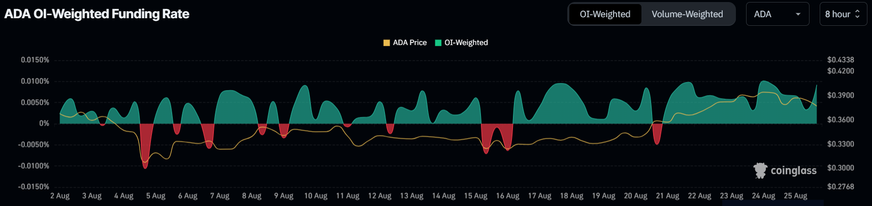 Tuy nhiên, Altcoin này đã chống lại áp lực bán mạnh nhờ nhu cầu tích cực từ phía nhà đầu tư. Tỷ lệ tài trợ (funding rate) tích cực của Cardano cho thấy nhà đầu tư đang ủng hộ một sự tăng giá. Chỉ số này phản ánh sự sẵn lòng của nhà giao dịch trả thêm phí trong thị trường phái sinh. Vì hợp đồng mở vị thế Long đang chiếm ưu thế so với hợp đồng Short, nó cho thấy sự lạc quan về hiệu suất tương lai của tiền điện tử này.