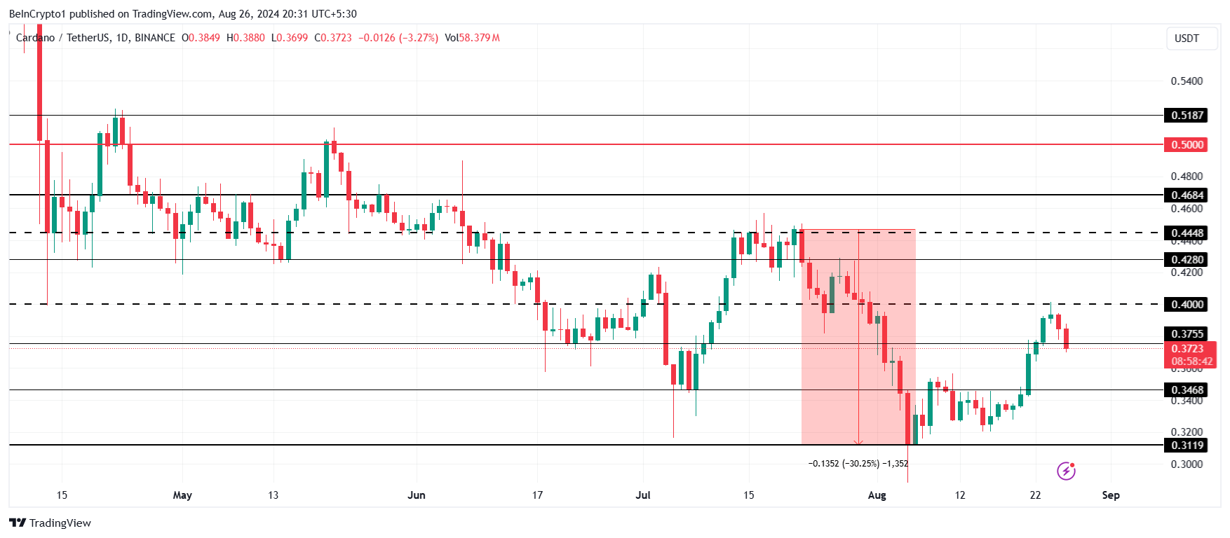 Tuy nhiên, nếu nhu cầu của nhà đầu tư lấn át sự bi quan vĩ mô, ADA có thể phục hồi. Việc vượt qua 0.40 USD sẽ mở ra cơ hội cho Altcoin này tăng lên 0.44 USD, vượt qua đó sẽ làm mất hiệu lực luận điểm giảm giá.