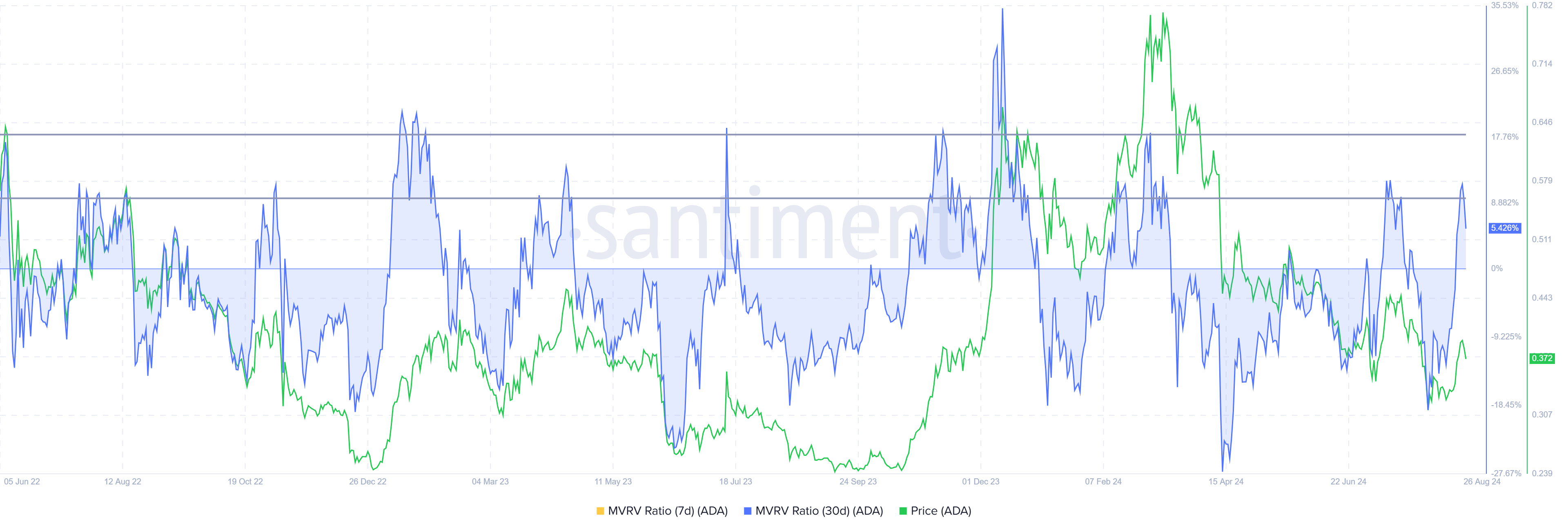Giá của Cardano đã giảm trong 24 giờ qua sau khi không thể vượt qua ngưỡng kháng cự 0.40 USD. Nguyên nhân là do đã có một chút bán ra sau khi tài sản tiền điện tử thế hệ thứ ba này bước vào vùng nguy hiểm của tỷ lệ giá trị thị trường so với giá trị thực tế (MVRV).