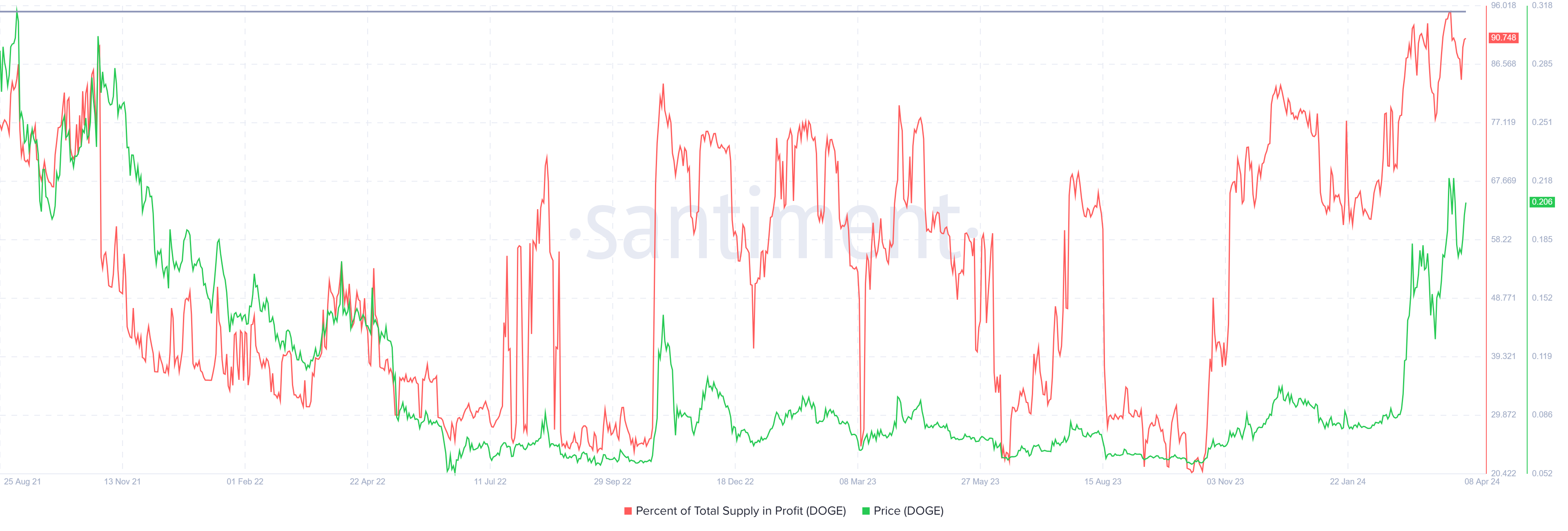 Điều này được chứng minh thêm bằng tổng nguồn cung DOGE đang có lợi nhuận. Đôi khi, khi nguồn cung có lợi nhuận đạt 95% tổng DOGE lưu hành. Đỉnh thị trường được hình thành, đồng nghĩa với sự điều chỉnh khi thị trường hạ nhiệt. Với tỷ lệ nguồn cung có lợi nhuận đang ở mức 90% vào lúc này, sẽ không có gì đáng ngạc nhiên nếu những ngày tới ghi nhận mức đỉnh của thị trường. Điều này sẽ làm tăng thêm xu hướng giảm, có thể dẫn đến sự sụt giảm giá.