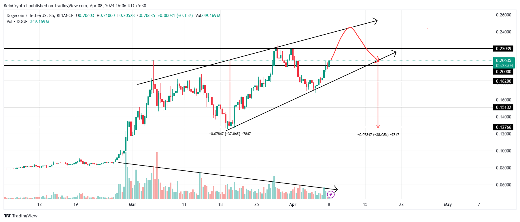 Giá của Dogecoin tại thời điểm BeInCrypto viết bài đang giao dịch ở mức 0.206 USD. Mặc dù mức tăng gần đây có thể gợi ý một đợt phục hồi sắp xảy ra, nhưng khung thời gian dài hạn cho thấy điều ngược lại. Đồng meme này hiện đang bị mắc kẹt trong một cái nêm đang tăng. Mô hình đảo chiều giảm giá này được đặc trưng bởi các đường xu hướng hội tụ nghiêng lên trên. Nó cho thấy một chuyển động giá giảm đáng kể, cho thấy đà suy yếu. Theo mô hình này, mục tiêu cho giá Dogecoin được đặt ở mức 0.127 USD, đánh dấu sự điều chỉnh gần 40%.