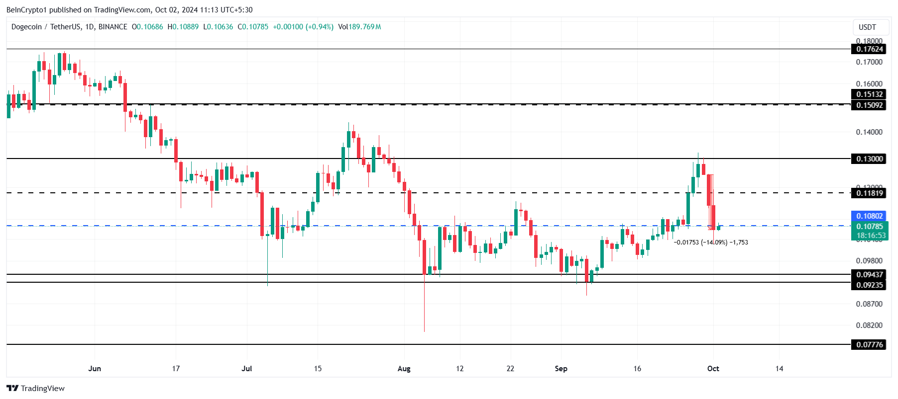 Nếu Dogecoin có thể biến 0.107 USD thành hỗ trợ, thách thức tiếp theo sẽ là vượt qua mức kháng cự 0.118 USD. Việc vượt qua ngưỡng này có thể mở đường cho một cuộc tăng giá hướng tới 0.130 USD, điều này có thể báo hiệu một sự phục hồi mạnh mẽ hơn cho DOGE.
