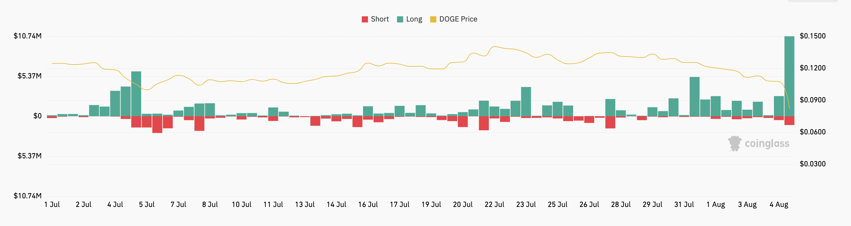 Ngoài việc điều chỉnh, Dogecoin đã ghi nhận giá trị thanh lý cao nhất kể từ giữa tháng Sáu. Thanh lý xảy ra khi một sàn giao dịch đóng hợp đồng mở của nhà giao dịch do không đủ số dư ký quỹ để giữ vị thế mở. Điều này cũng có thể xảy ra do đòn bẩy cao và biến động mạnh, như hiện tại trên thị trường. Theo Coinglass, tổng cộng 14.74 triệu USD đã được thanh lý trong 24 giờ qua. Trong đó, các vị thế mua chiếm 13.08 triệu, trong khi các vị thế bán chỉ chịu thiệt hại 1.66 triệu USD.