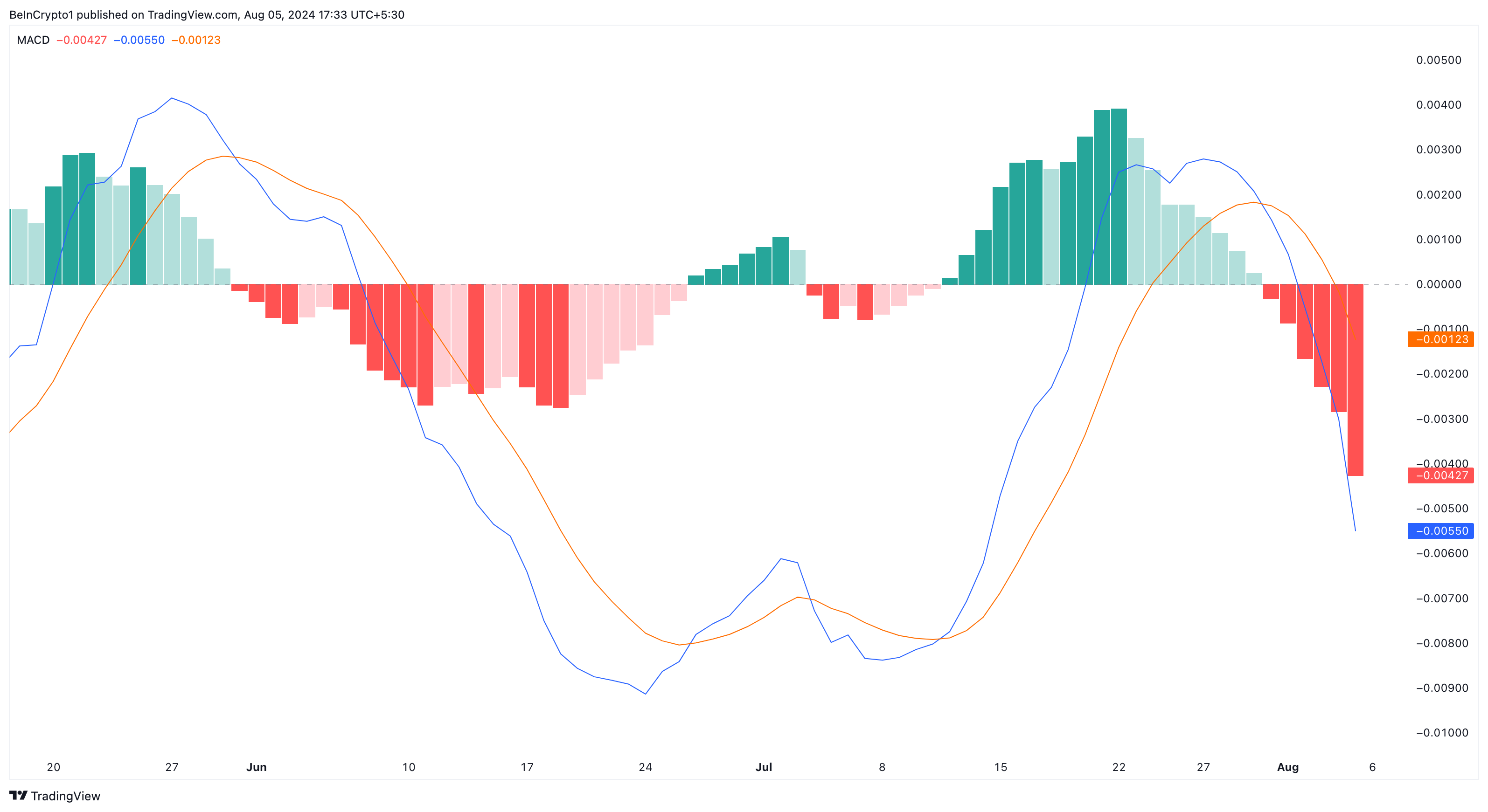 Ví dụ, chỉ số MACD, sử dụng hai trung bình động để xác định xu hướng giá và động lượng, đang ở vùng âm. Thông thường, chỉ số MACD dương cho thấy động lượng tăng. Do đó, chỉ số này cho thấy động lượng xung quanh DOGE đang giảm. Nếu tình trạng này tiếp tục, đồng tiền meme này có thể tiếp tục chịu áp lực bán ra, hoàn toàn làm mờ đi sự phục hồi tích cực của nó.