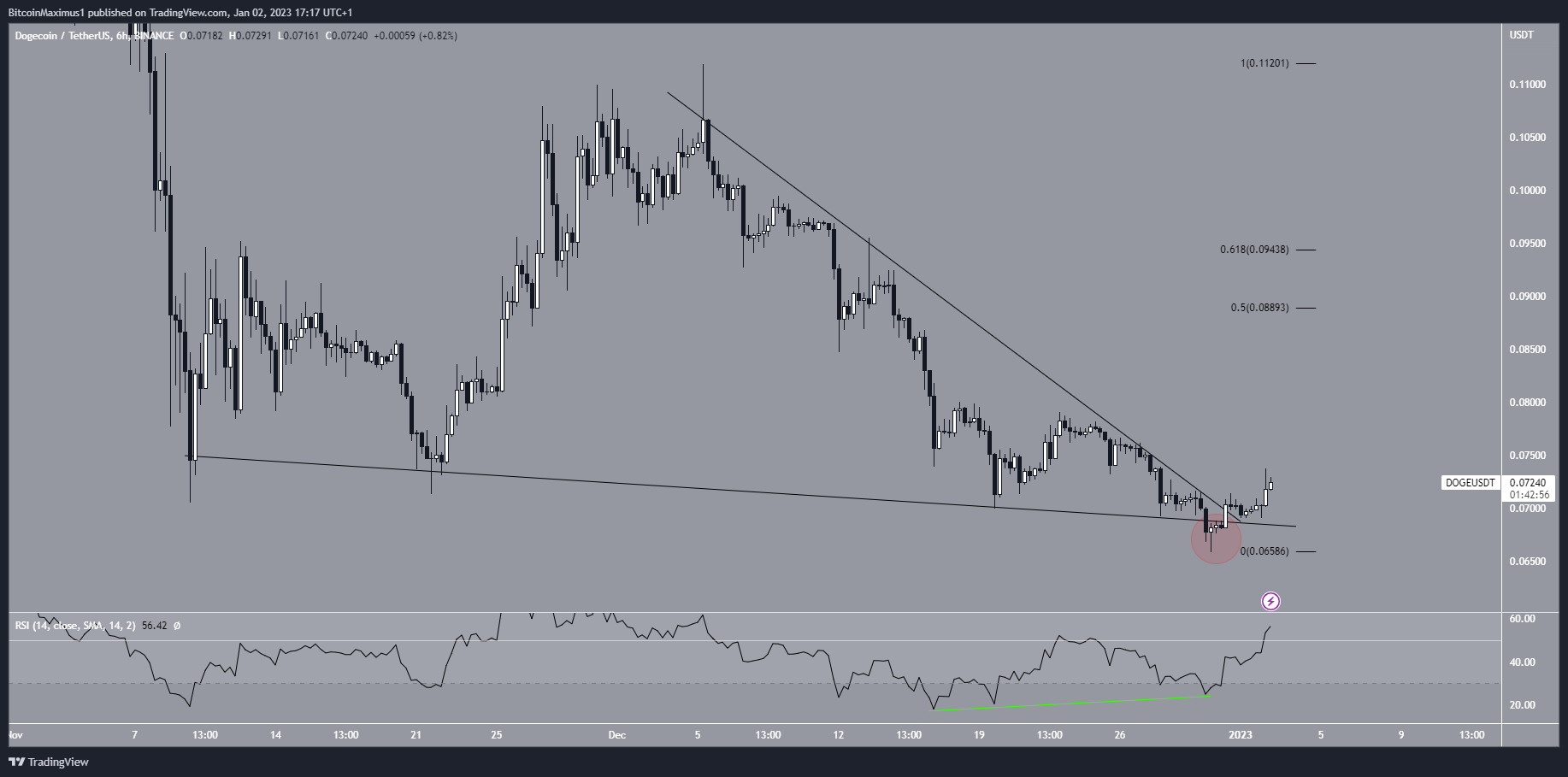 Giá Dogecoin đã giao dịch bên trong một nêm giảm dần kể từ ngày 09/11. Đây được coi là một mô hình tăng giá, có nghĩa là trong phần lớn trường hợp, giá sẽ bứt phá và tăng lên từ đây. Vào ngày 30 và 31/12, giá DOGE dường như phá vỡ khỏi mô hình nêm (vòng tròn màu đỏ). Tuy nhiên, nó đã thất bại. Giá tiếp tục lấy lại đường hỗ trợ trong 24 giờ sau đó và thoát ra khỏi nêm giảm dần. Việc xuất hiện tin tức tích cực về Dogecoin Foundation ra mắt quỹ CoreFund nói trên có khả năng đã hỗ trợ cho sự gia tăng này.