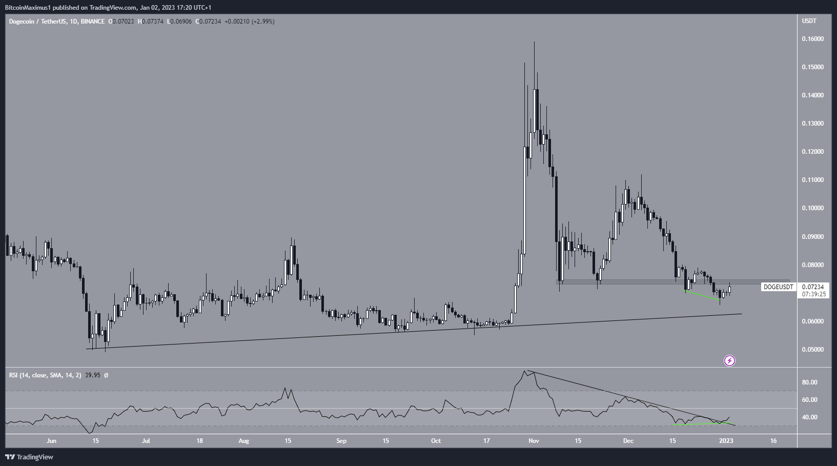 Tuy nhiên, mặc dù không thể lấy lại khu vực này, chỉ báo RSI ngày đã tạo ra một lượng phân kỳ tăng đáng kể. Sự phân kỳ như vậy thường xảy ra trước các chuyển động đi lên. Hơn nữa, chỉ báo đã thoát ra khỏi đường kháng cự giảm dần (màu đen), hỗ trợ khả năng giá đi lên. Nếu bị từ chối, giá DOGE có thể quay về đường hỗ trợ tăng dần dài hạn ở mức 0.06 USD và bật lên lại tại đây.