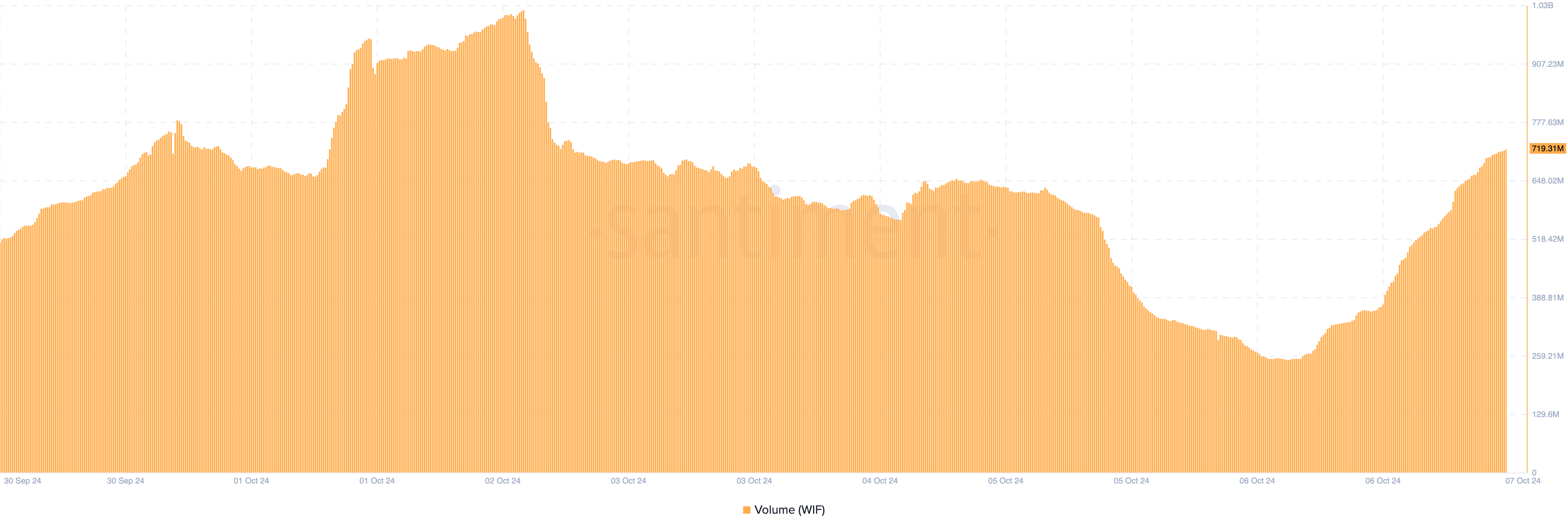 Tại thời điểm viết bài, giá WIF đang ở mức 2.68 USD. Ngoài việc tăng giá, đồng tiền meme này cũng chứng kiến sự bùng nổ về khối lượng giao dịch. Theo Santiment, khối lượng giao dịch của Dogwifhat đã đạt 719.31 triệu USD trong 24 giờ qua, cho thấy sự quan tâm ngày càng tăng đối với token khi nó tiếp tục đà phục hồi trong hai tuần.