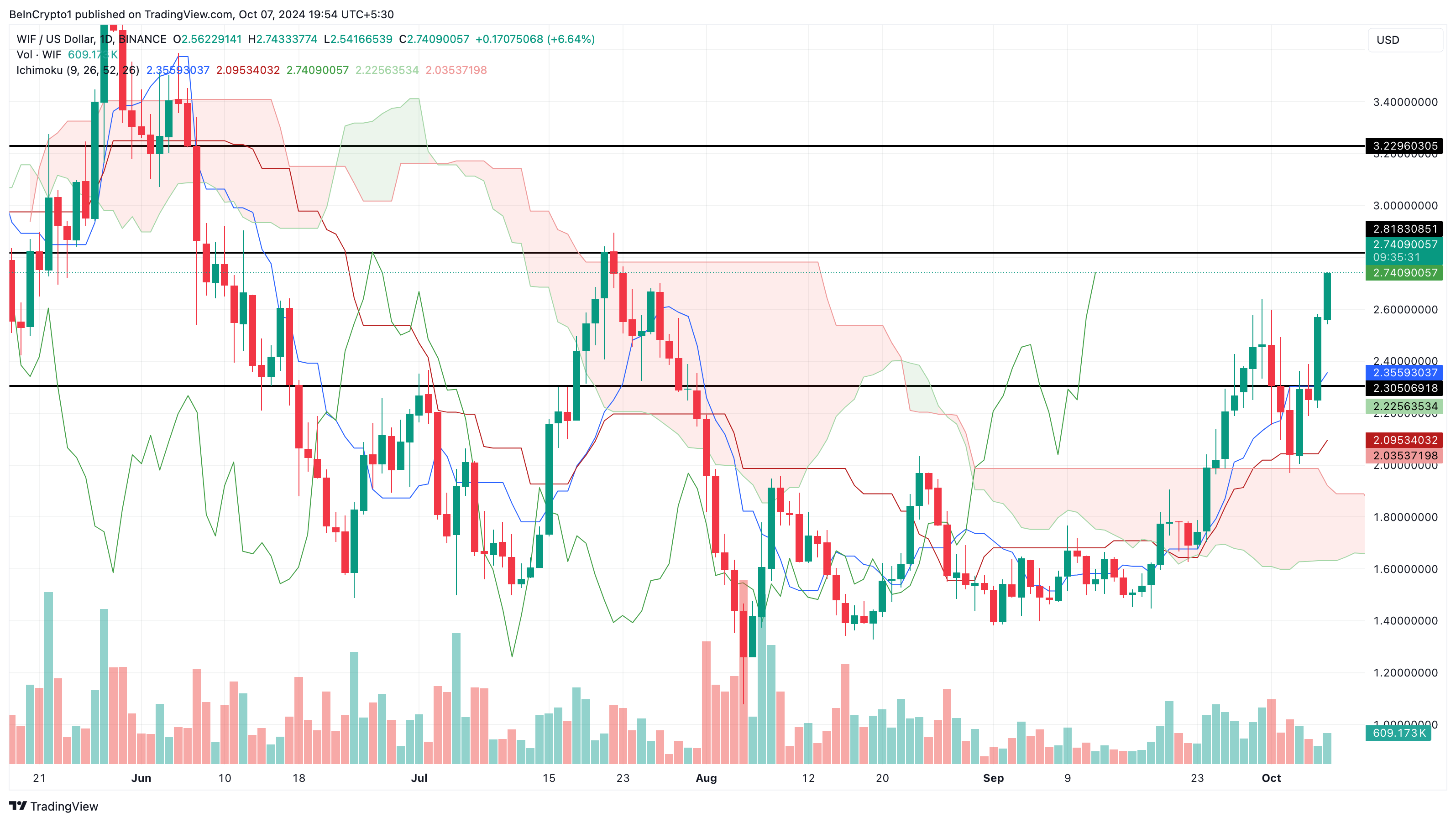 Thông thường, khi giá nằm dưới đám mây, xu hướng là giảm. Tuy nhiên, tại thời điểm viết bài, đám mây đang nằm dưới giá WIF, cho thấy xu hướng tăng cho đồng tiền meme này. Nếu điều này vẫn giữ nguyên, giá trị của đồng tiền meme có thể tăng lên trên mức kháng cự 2.82 USD, có thể lên đến 3.22 USD trong ngắn hạn.