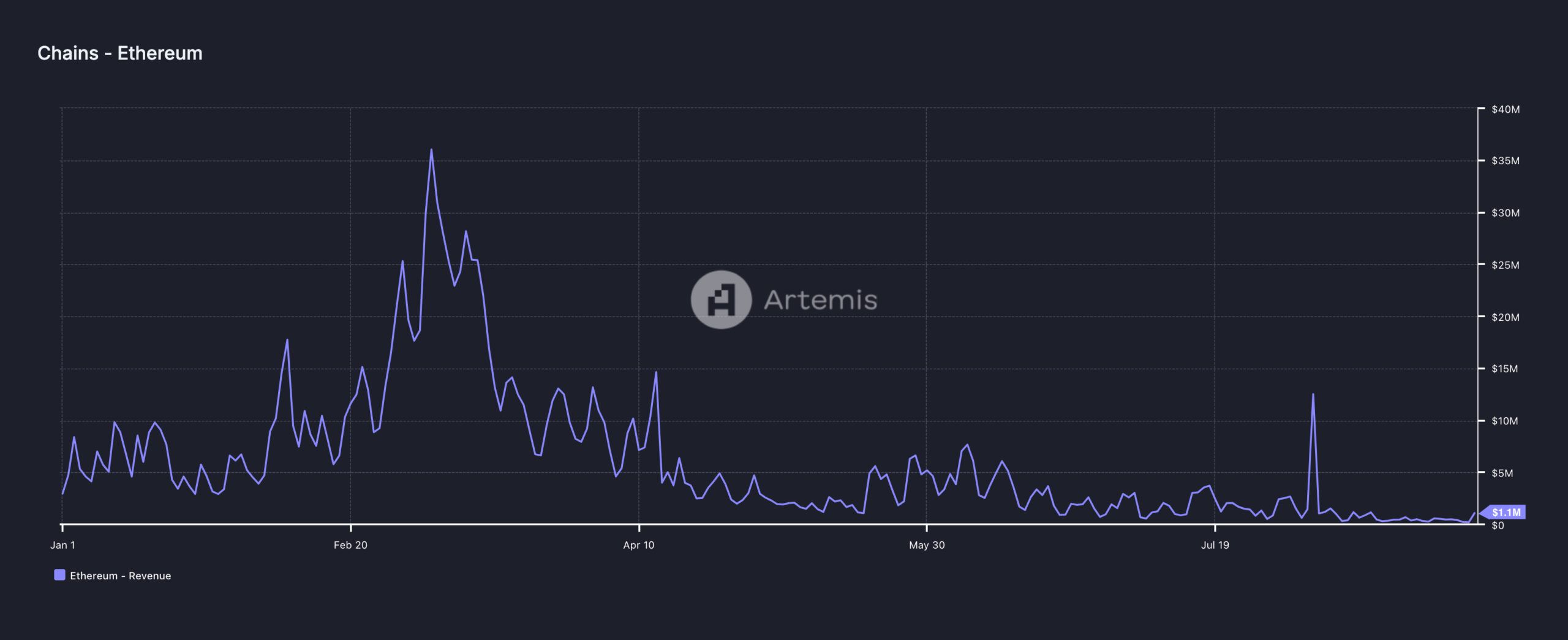 Theo dữ liệu từ Artemis, doanh thu của Ethereum đã giảm xuống mức thấp nhất trong năm nay. Sự sụt giảm nghiêm trọng này là một sự tương phản rõ rệt so với giá trị vào tháng 3. Trong khoảng thời gian đó, doanh thu của blockchain này đã tăng vọt lên 36 triệu USD.