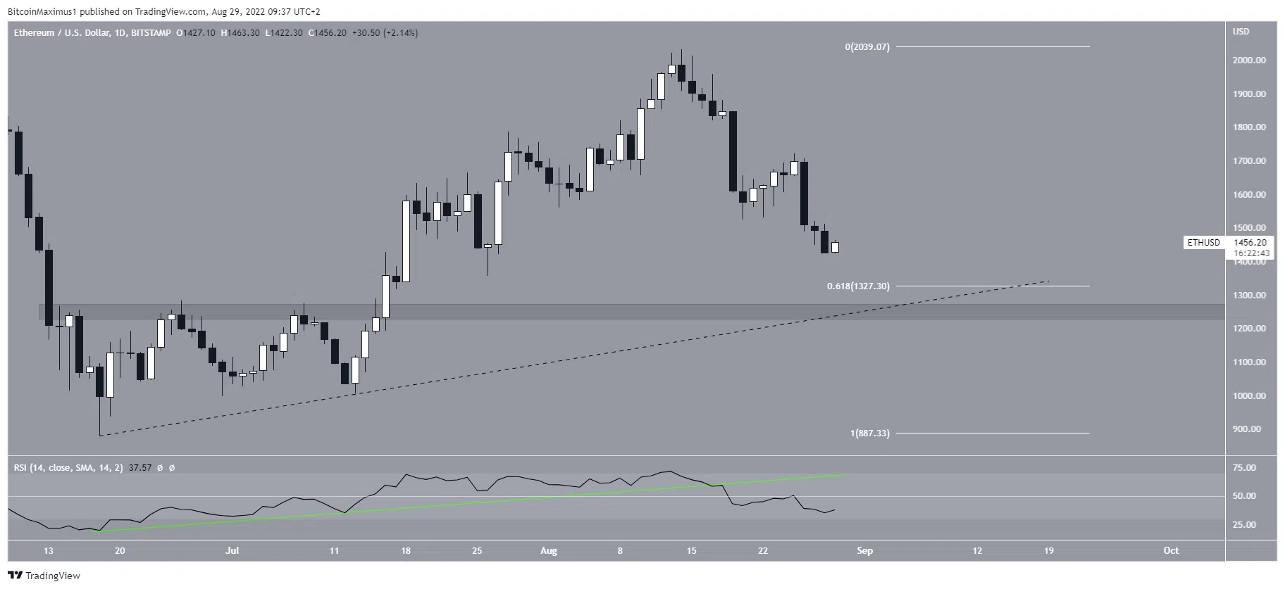 Các số liệu từ biểu đồ hàng ngày cho thấy khả năng giá sẽ bị từ chối trên khung hàng tuần. Lý do cho điều này là RSI đã phá vỡ khỏi đường hỗ trợ tăng dần sau khi giá đạt mức cao nhất vào ngày 14 tháng 8 nói trên. Nếu xu hướng giảm tiếp tục, sẽ có sự hợp nhất của các mức hỗ trợ được tìm thấy trong khoảng 1,250 USD đến 1,330 USD. Hỗ trợ này được tạo bởi: