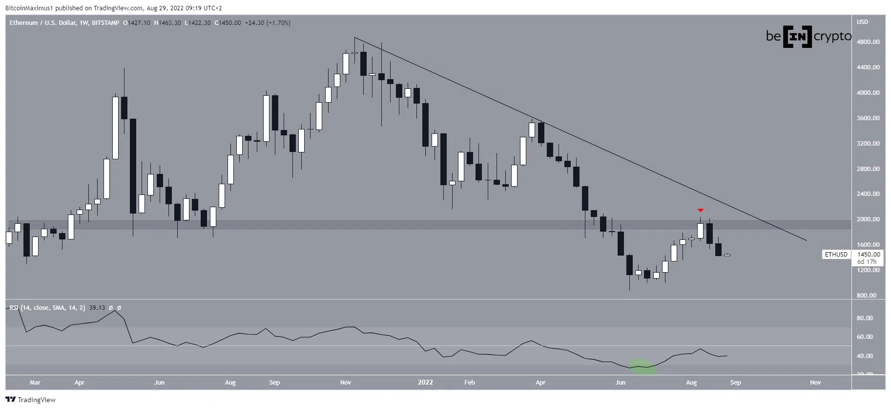 Ethereum (ETH) đã giảm xuống dưới đường kháng cự giảm dần kể từ khi đạt mức giá cao nhất mọi thời đại là 4,868 USD vào tháng 11 năm 2021. Động thái đi xuống cho đến nay đã dẫn đến mức thấp nhất tại 880 USD vào tháng 6 năm 2022. Mức thấp này cũng trùng với mức đáy của RSI hàng tuần (vòng tròn màu xanh lá cây). Giá đã phục hồi ngay sau đó, khiến chỉ báo RSI di chuyển ra ngoài vùng quá bán của nó.