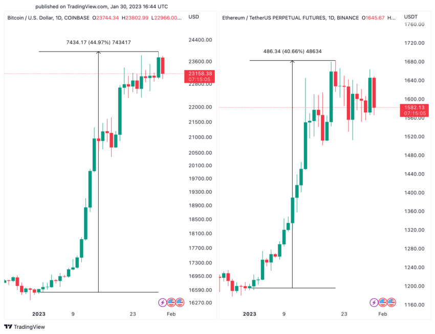Ethereum (ETH) đã trở thành tiêu đề cho việc chuyển sang giảm phát hai tuần trước và Bitcoin (BTC) tăng đáng kể trong tháng 1. Theo Ultrasound Money, tỷ lệ phát hành ròng hoặc tỷ lệ lạm phát hàng năm của tiền điện tử lớn thứ hai đã giảm xuống dưới 0 vào ngày 15/1. Điều này có nghĩa là chuỗi khối hợp đồng thông minh hàng đầu hiện đang đốt cháy (burn) nhiều ETH hơn so với số lượng đồng coin đang được đúc (mint), trái ngược với BTC. Mặc dù vậy, giá Ethereum vẫn tăng trưởng kém hiệu quả so với Bitcoin khi tháng 1 sắp kết thúc.