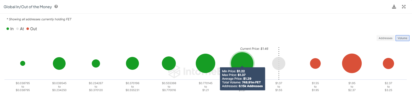 Theo ghi nhận của BeInCrypto, sự tăng giá FET trong những ngày qua đã dẫn đến một sự gia tăng lợi nhuận đáng kể. Theo chỉ số Global In/Out of the Money (GIOM), khoảng 748 triệu FET trị giá hơn 1.06 tỷ USD đã trở nên có lợi nhuận trong tuần này.