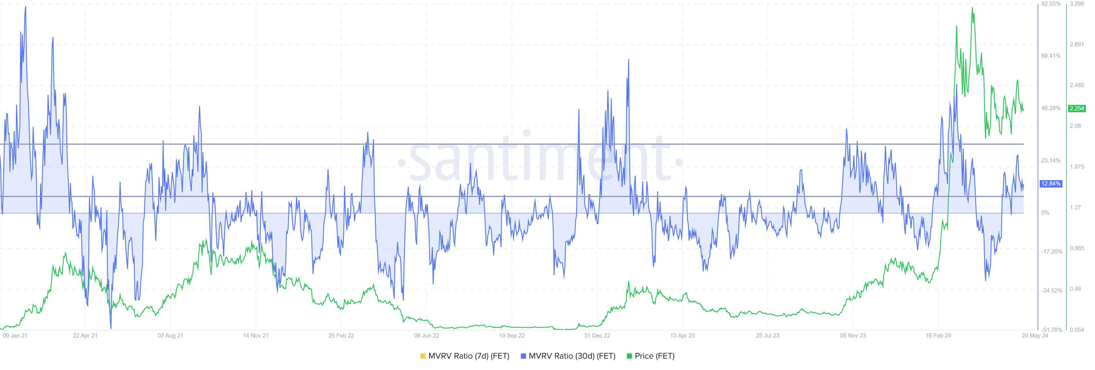 Hơn nữa, tỷ lệ Giá trị thị trường trên Giá trị thực hiện (MVRV) cũng ủng hộ giả thuyết giảm. Tỷ lệ MVRV đánh giá lãi hoặc lỗ của nhà đầu tư. MVRV 30 ngày của Fetch.ai ở mức 12%, báo hiệu lợi nhuận, có khả năng thúc đẩy lực bán.