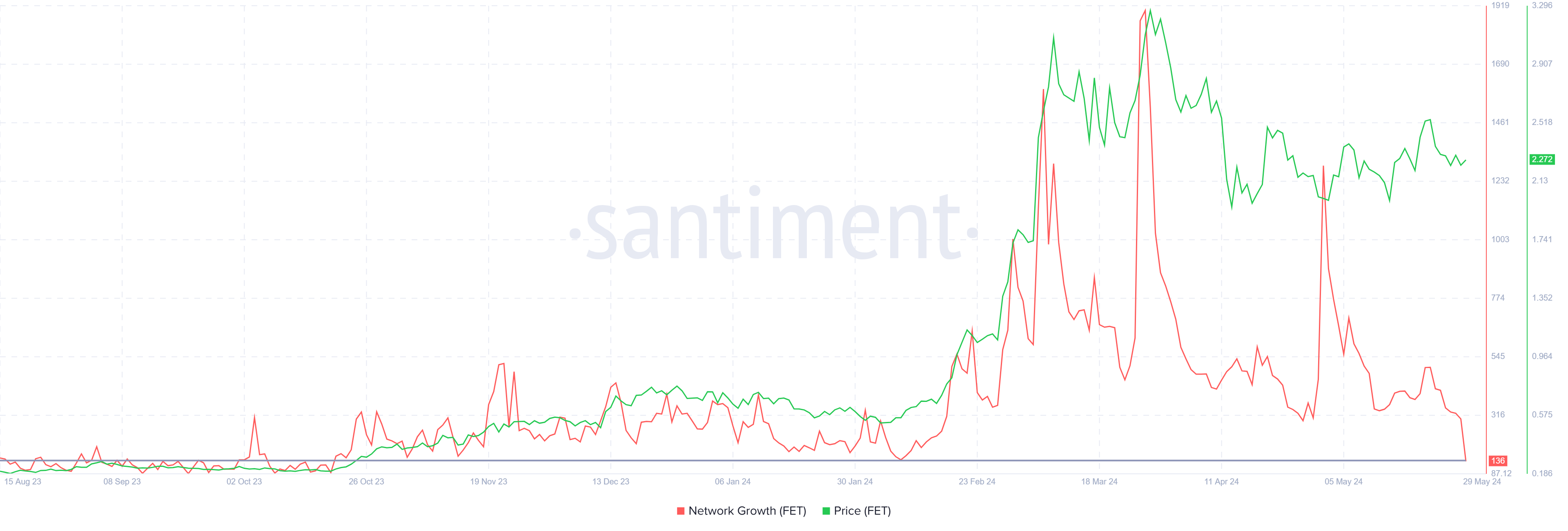Giá của Fetch.ai có thể chứng kiến đà giảm khi các nhà đầu tư đang thực hiện các động thái giảm giá vào lúc này. Dấu hiệu đầu tiên của điều này có thể nhìn thấy trong sự tăng trưởng mạng của tài sản, trong đó đề cập đến sự hình thành các địa chỉ mới trên mạng.