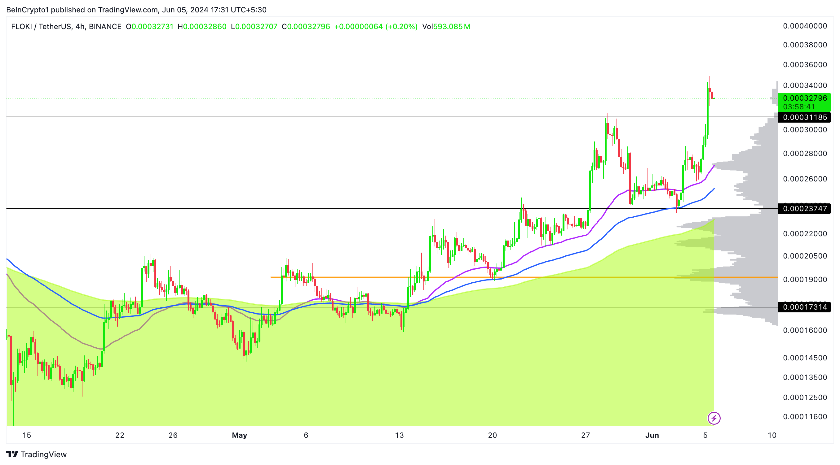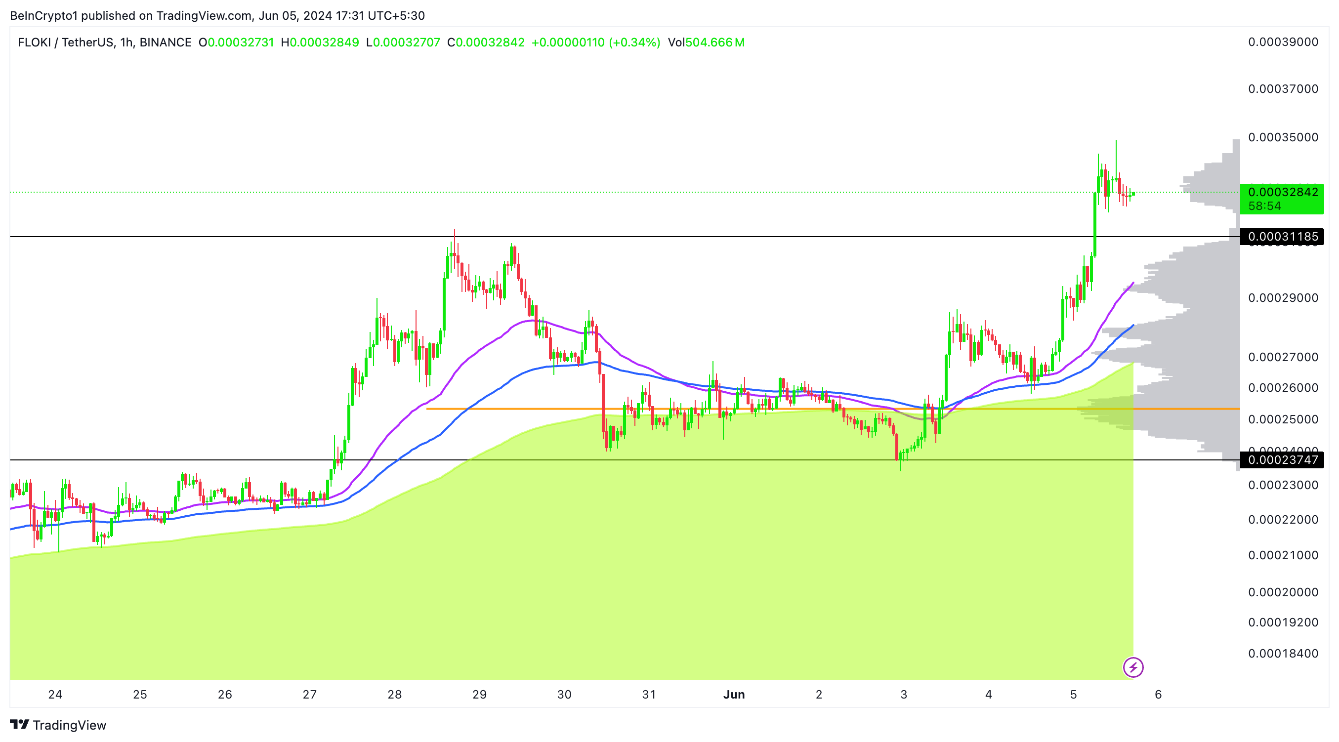 Volume profile đã làm nổi bật các phạm vi hỗ trợ và kháng cự quan trọng, với mức profile trên 4 giờ hiện tại chỉ ra một khu vực kháng cự yếu ở mức giá hiện tại. Một đợt điều chỉnh tiềm năng có thể đưa giá trở lại khoảng 0.00028 USD trước khi tiếp tục xu hướng tăng lên các mức cao mới.