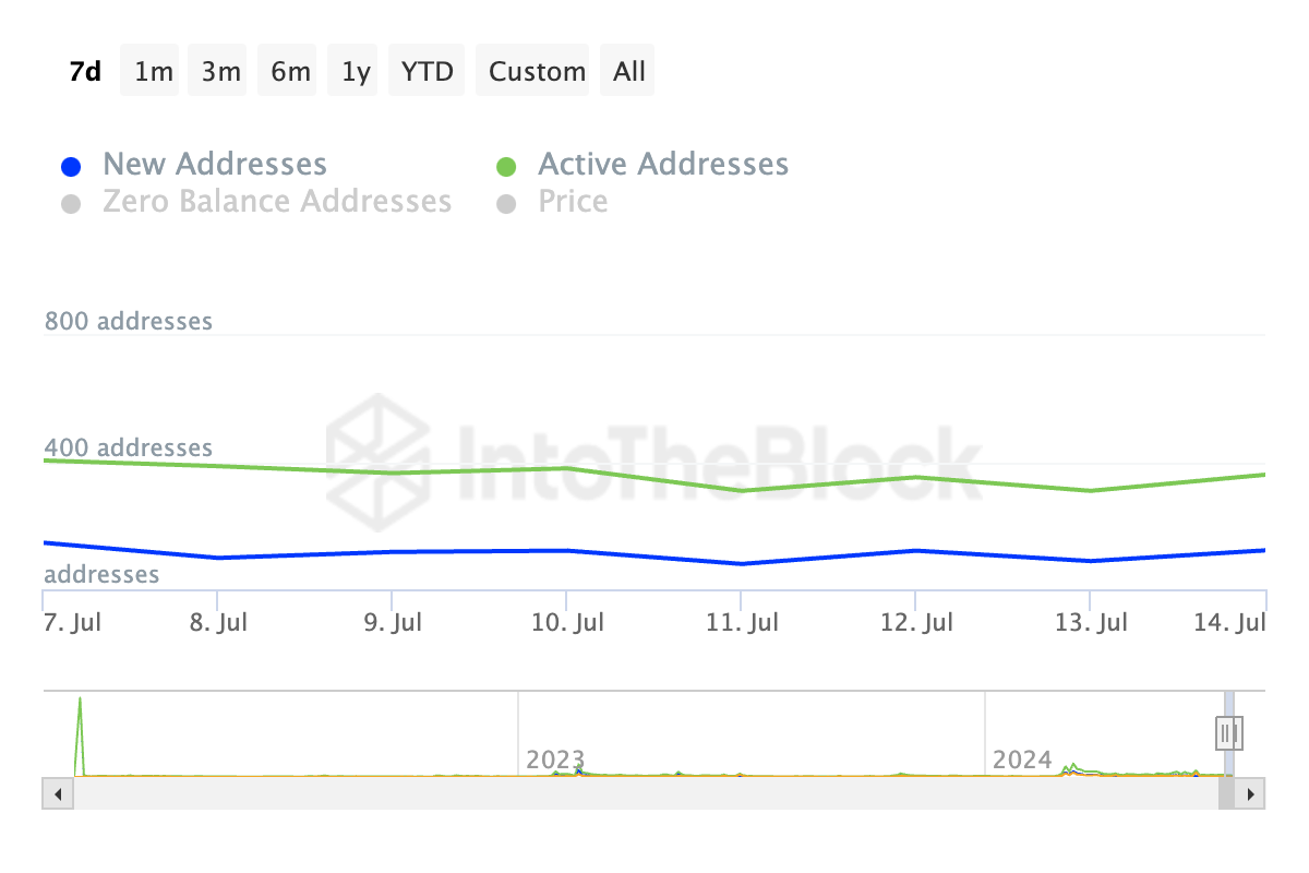 Dữ liệu từ IntoTheBlock cho thấy số lượng địa chỉ FLOKI có tham gia ít nhất một giao dịch trong ngày đã giảm 11% trong bảy ngày qua. Ngoài ra, trong cùng thời gian, số lượng địa chỉ mới được tạo để giao dịch meme coin này cũng đã giảm 16%.