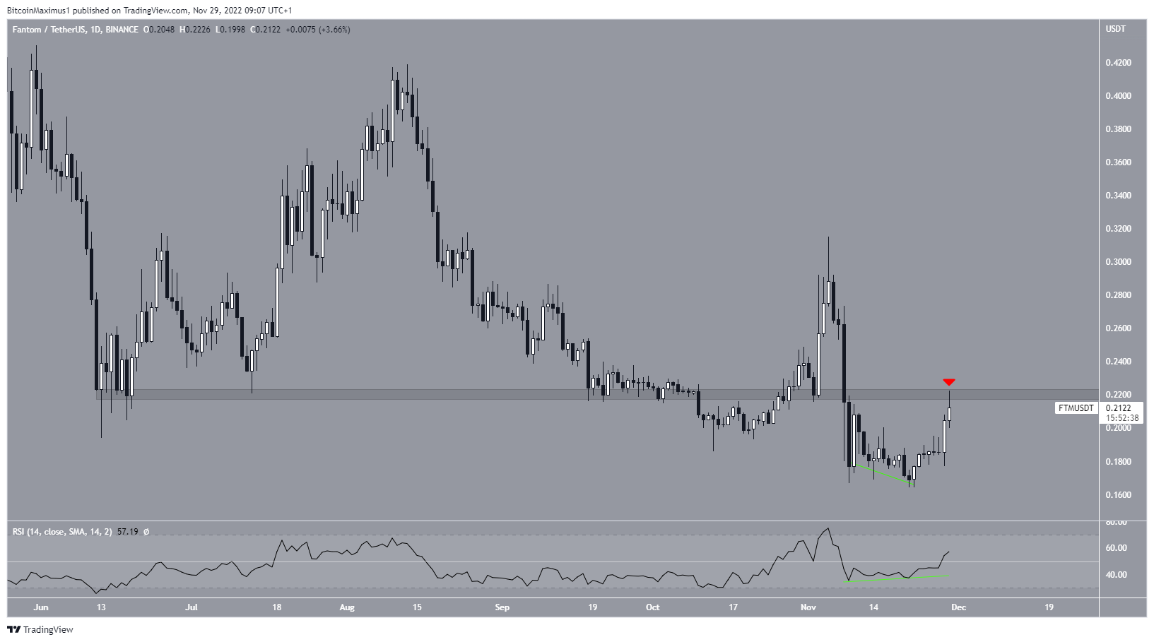 Hành động giá từ khung thời gian ngày cho thấy FTM đã giảm kể từ khi đạt mức cao 0.315 USD vào ngày 05/11, dẫn đến mức thấp tại 0.164 USD vào ngày 22/11. Tiếp theo, giá FTM đã tăng trở lại sau khi chỉ báo RSI tạo phân kỳ tăng (đường màu xanh lá cây). Tốc độ tăng được đẩy nhanh đáng kể trong 24 giờ qua. Chỉ báo RSI hiện ở trên mức 50, một dấu hiệu của xu hướng tăng.