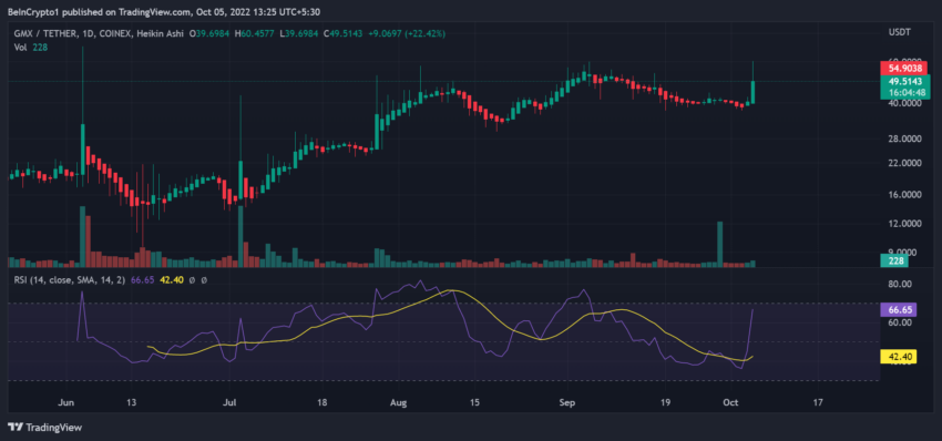 Biểu đồ giá của GMX đã cho thấy sự hưng phấn của các NĐT cá nhân tăng cao khi đồng Altcoin này tăng vọt gần 50% chỉ trong một ngày. Chỉ báo RSI đã đi lên, tiến vào vùng quá mua và cho thấy mức độ tập quan tâm cao của người mua.