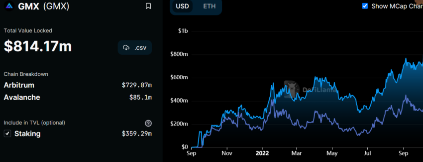 Mã thông báo gần đây đã có nhiều đợt tăng giá tương tự như vậy trong 1 ngày, qua đó đưa nó lên trên các mức kháng cự quan trọng. Hơn nữa, dữ liệu từ DeFiLlama cho thấy sự gia tăng mạnh mẽ trong tổng giá trị bị khóa của GMX, đứng ở mức cao nhất mọi thời đại là 814.17 triệu USD.