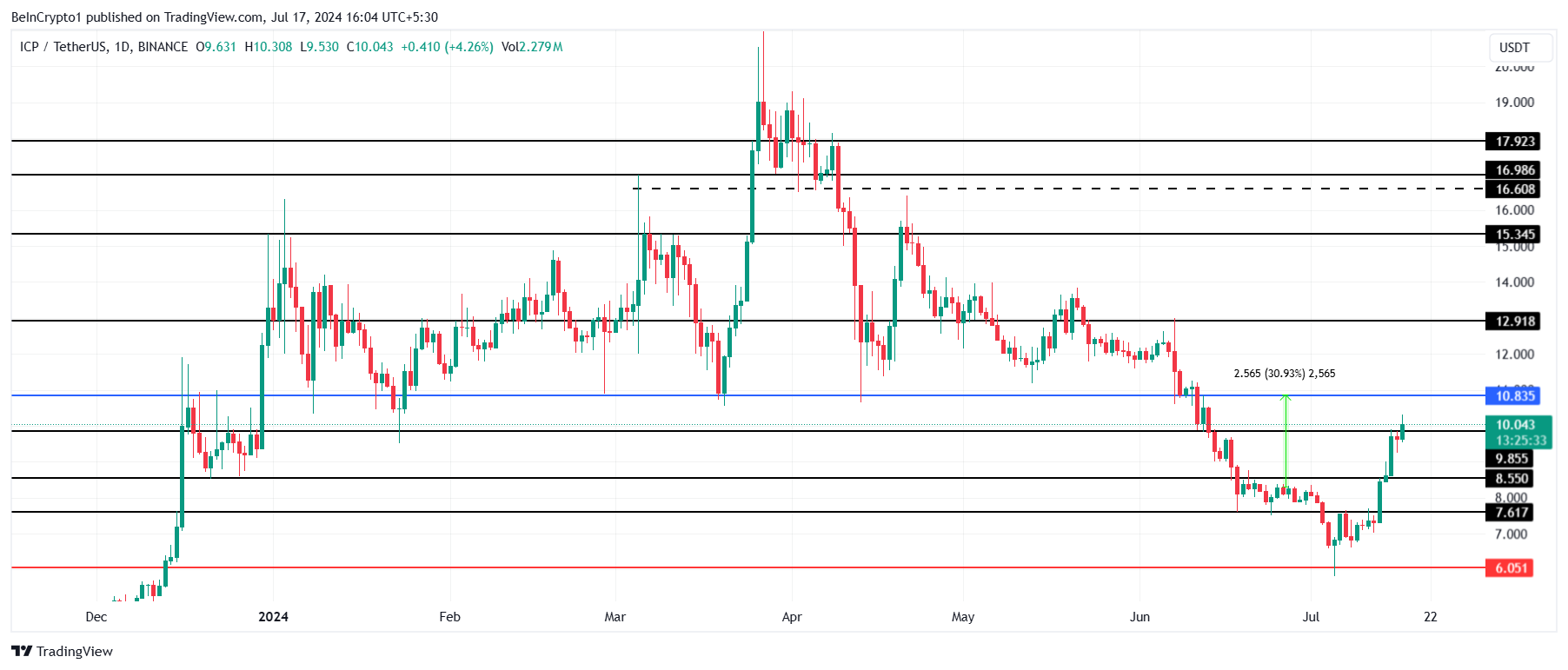 Giá ICP đã tăng hơn 37% trong tuần trước, đưa altcoin này giao dịch ở mức 10.04 USD tại thời điểm bài viết. Tuy nhiên, altcoin này phải đối mặt với mức kháng cự mạnh ở 10.83 USD, đây từng là mức hỗ trợ vững chắc từ đầu năm 2024 đến hết tháng 5.