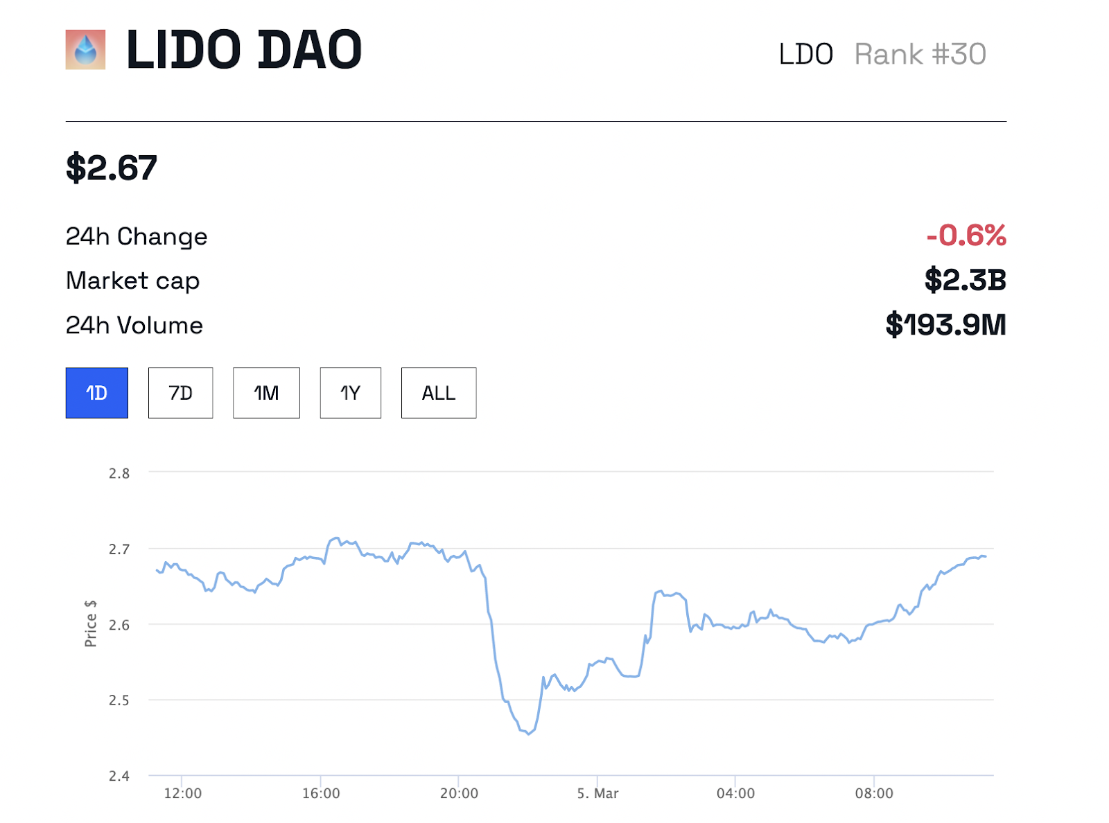 Sau khi Hoffman giải thích về tin đồn, giá Lido đã phục hồi nhẹ và hiện đang giao dịch ở mức 2.67 USD tại thời điểm BeInCrypto viết bài.