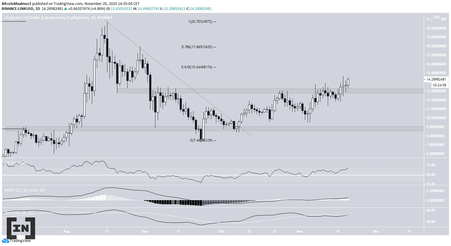 Giá LINK đã tăng đáng kể kể từ khi nó cố gắng phá vỡ đường kháng cự chéo giảm dần vào ngày 5 tháng 10. Động thái giá tăng chậm nhưng kéo dài. Khi giá vừa đột phá khỏi đường kháng cự 13,10 USD và xác nhận mức hổ trợ tiếp tục xu hướng tăng.