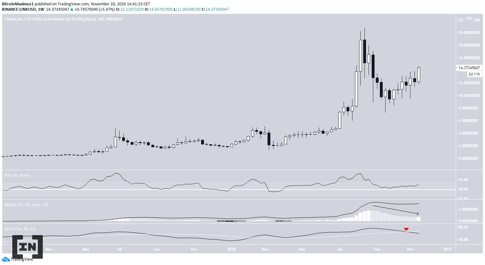 Điều đáng quan tâm là biểu đồ hàng tuần nhận thấy có xu hướng giảm. Về tổng thể, giá LINK vẫ trong quá trình thoái lui vì đợt ảnh hưởng giá tháng 8.