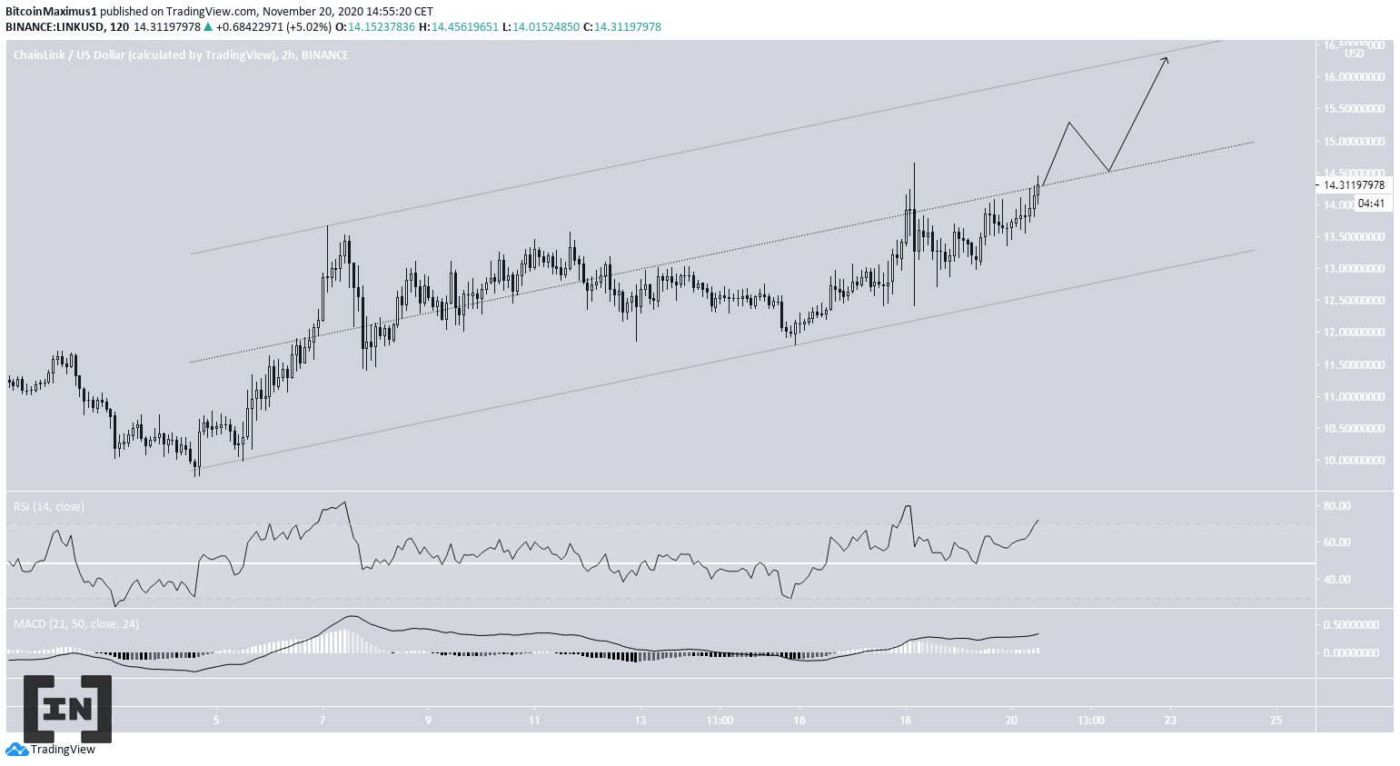 Biểu đồ khung thời gian hai giờ, LINK đang giao dịch trong phạm vi giá kênh chéo dốc lên từ 4/11. Vào lần kiểm tra cuối, giá được giao dịch quay lại kênh xu hướng ban đầu.