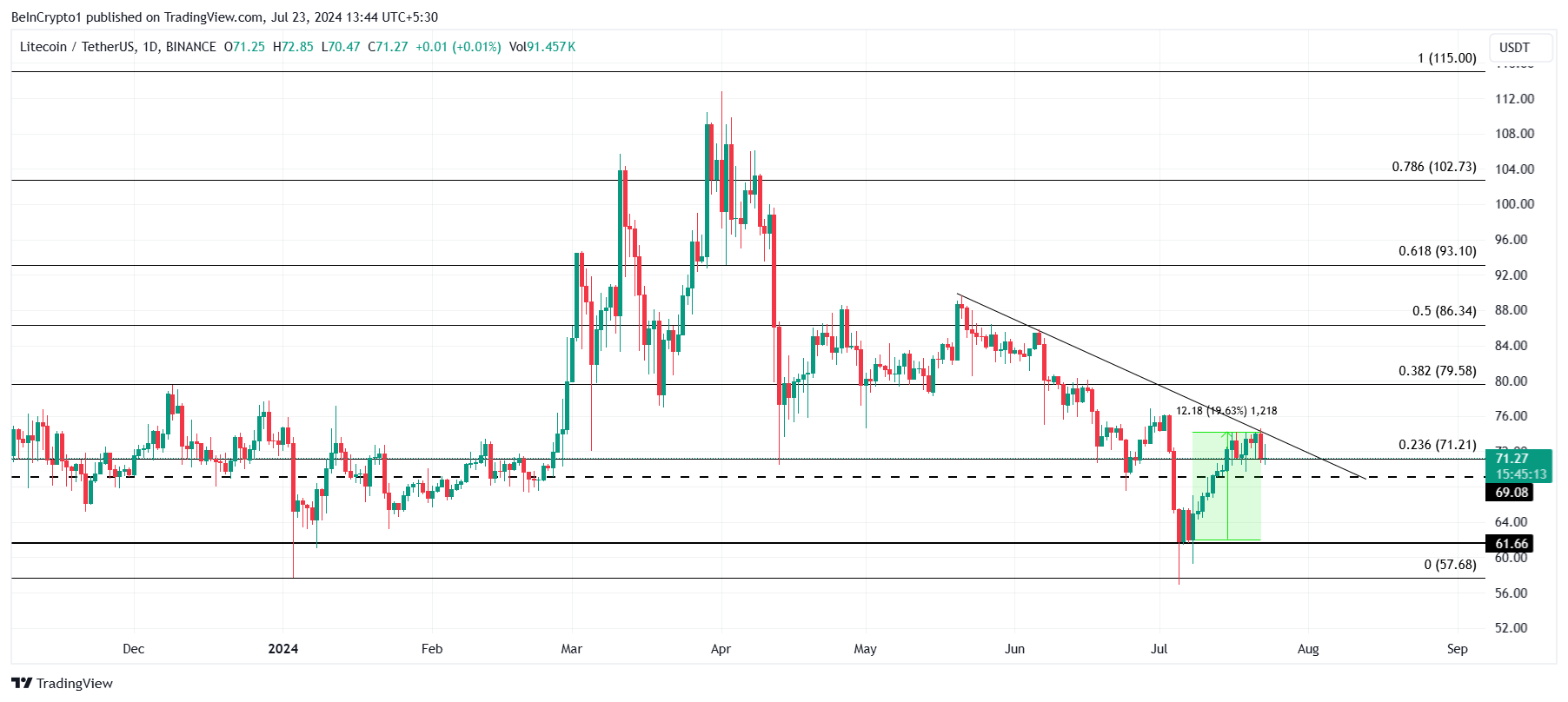 Trong hai tháng qua, giá của Litecoin đã di chuyển dưới một đường xu hướng giảm, không thể phá vỡ nó lần thứ ba. Xu hướng giảm này đã kéo Altcoin này xuống từ 90 USD xuống còn 71 USD tại thời điểm viết bài.