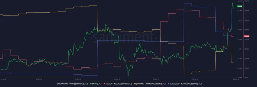 Hơn nữa, kể từ ngày 02/11, một trong những nhóm cá voi LTC lớn nhất nắm giữ từ 1 triệu – 10 triệu LTC đã tăng nắm giữ từ 2.7 triệu LTC. Nhóm tập đã này thêm 2.4 triệu LTC và điều này có thể là chất xúc tác quan trọng đối với giá Litecoin.