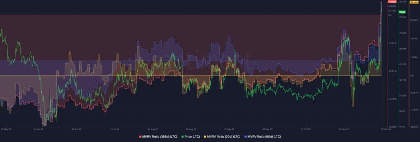 Đáng chú ý, MVRV 90 ngày cũng đã chứng kiến một sự gia tăng đột biến. Với MVRV 365 ngày, 90 ngày và 30 ngày trong vùng tích cực, điều tương tự trong quá khứ đã cho thấy lợi nhuận cho những người nắm giữ LTC trung và dài hạn.