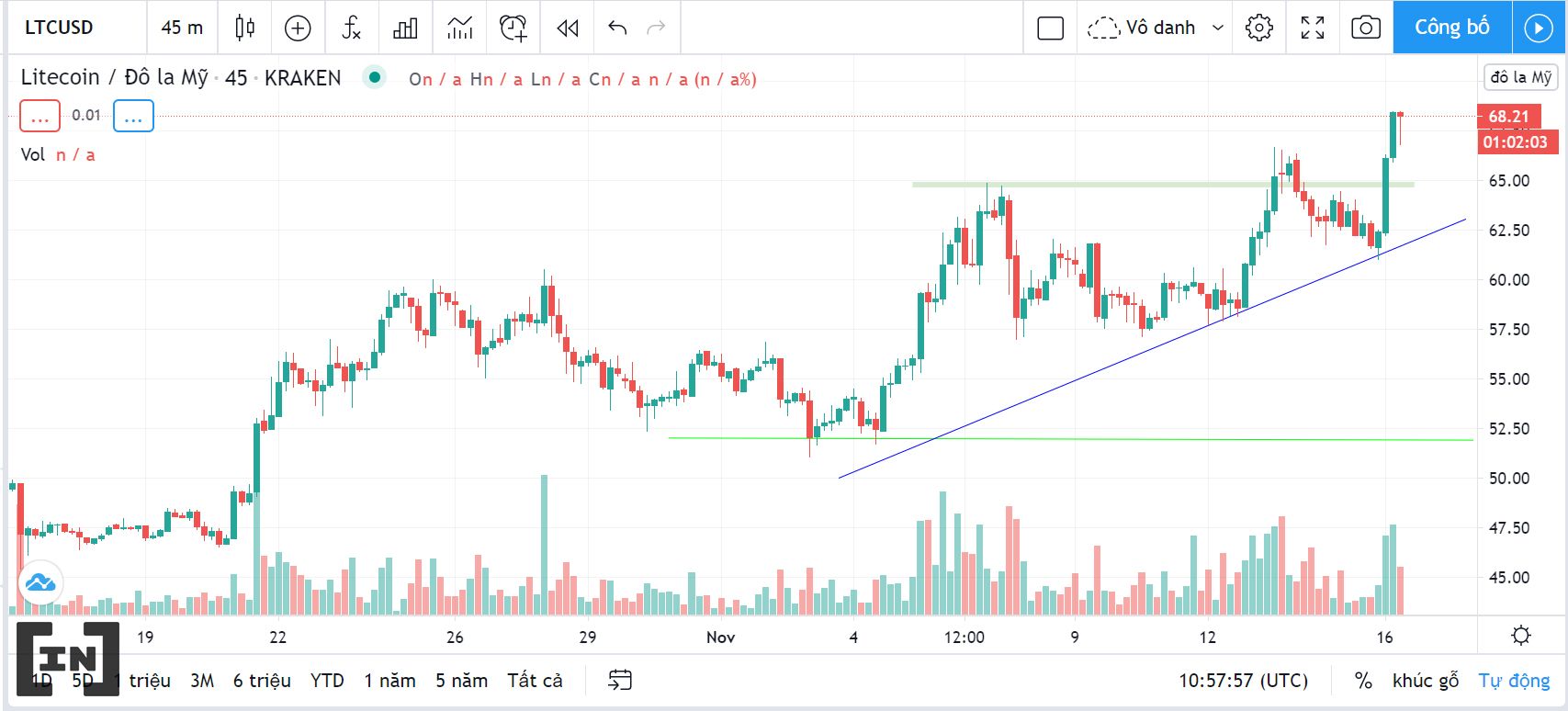 Vào ngày 12.11, LTC đổi chiều giảm xuống 58,51 chạm đường hỗ trợ chéo tăng dần. Giá có động thái bậc lên dịch chuyển lên tạo định 66 USD. Theo ghi nhận ngày 13.11, giá LTC cố gắng phá vỡ đường kháng cự ngang chạm mức 65,24 USD.
