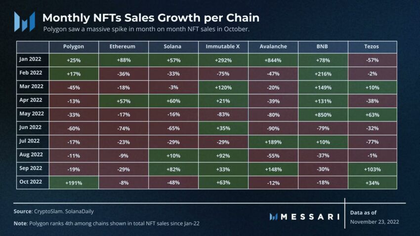 Theo dữ liệu BeInCrypto ghi nhận từ Messari, gần đây Polygon đã chứng kiến doanh số NFT tăng 191% kể từ cuối tháng 9. Starbucks, Reddit và Meta đã bắt đầu tích hợp Polygon và có thể chính những điều này đã hỗ trợ sự phát triển phân khúc NFT của nền tảng này.