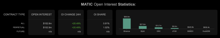 Tại thời điểm BeInCrypto viết bài này, giá MATIC đã vượt qua vùng hỗ trợ 0.85 USD và đường trung bình động đơn giản 100 ngày. Điều này phần nào cho thấy triển vọng tăng giá trong thời gian tới. Hơn nữa, lãi suất mở (Open Interest – OI) của MATIC đã tăng hơn 20% trong 24 giờ qua.
