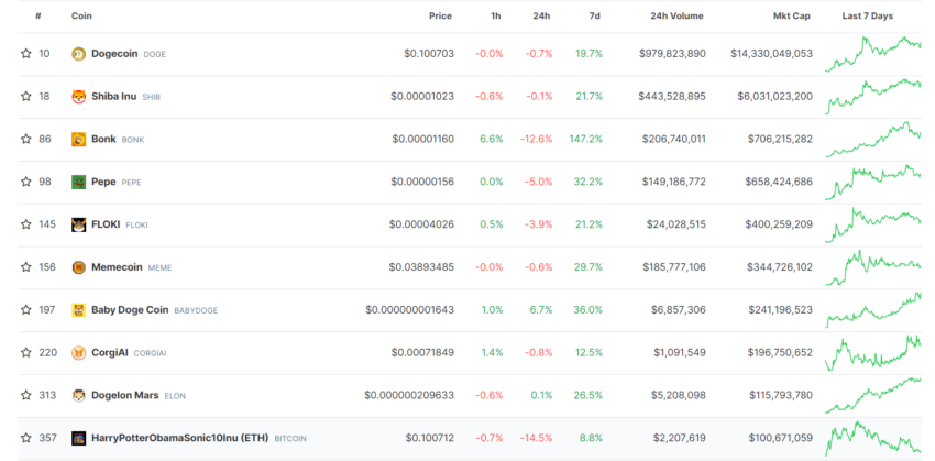 Các meme coin khác như Floki, Pepe, Dogecoin và Shiba Inu cũng ghi nhận mức tăng đáng kể trong tuần qua trong bối cảnh tình hình thị trường được cải thiện. Dữ liệu từ BeInCrypto cho thấy những tài sản này đã đạt mức tăng hai con số trong tuần, với một số nhà phân tích nhấn mạnh tiềm năng tăng giá của chúng.