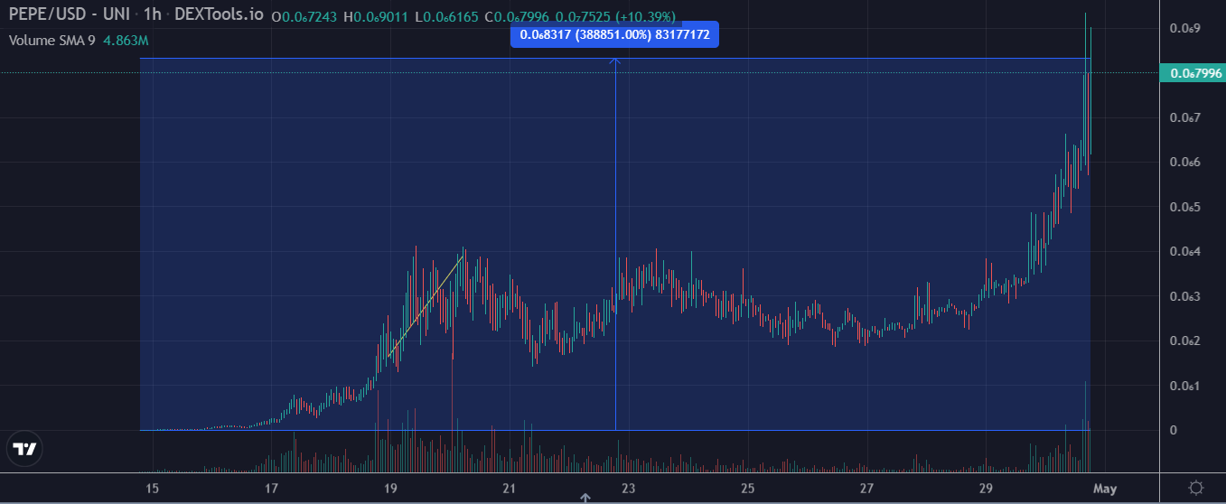 Giá meme coin PEPE đã đạt mức cao nhất mọi thời đại mới là 0.000000816 USD. So với mức giá kể từ khi ra mắt vào ngày 14/4, giá đồng coin này đã ghi nhận mức tăng gần 38,900%.