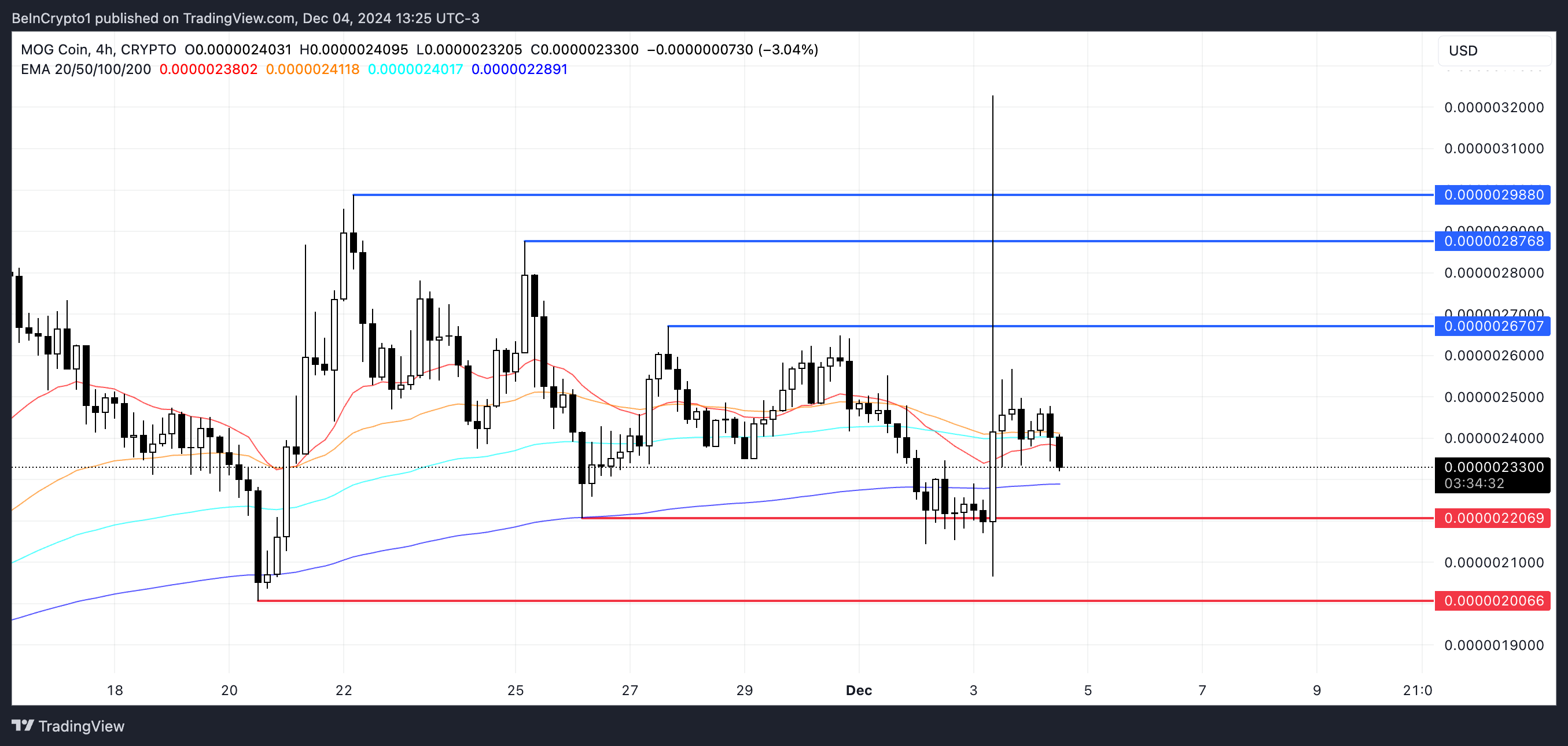 Các đường EMA của MOG hiện đang hiển thị tín hiệu giảm giá, với các đường ngắn hạn cắt xuống dưới các đường dài hạn. Nếu xu hướng giảm này tiếp tục, giá có thể kiểm tra các mức hỗ trợ gần 0.00000220 USD và 0.0000020 USD. Mặc dù giảm trong 24 giờ qua, MOG vẫn là một trong những meme coin nổi bật nhất trong hệ sinh thái Base, với vốn hóa thị trường gần 1 tỷ USD.