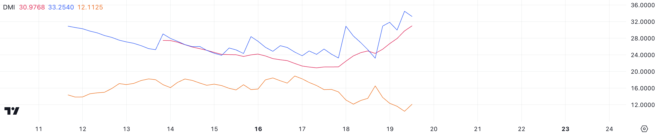 ADX đo lường sức mạnh của một xu hướng mà không chỉ ra hướng của nó. Các giá trị trên 25 biểu thị một xu hướng mạnh, trong khi các giá trị dưới 20 chỉ ra một thị trường yếu hoặc không có xu hướng. ADX của MOVE ở mức 30.9 xác nhận một xu hướng tăng mạnh, với D+ cho thấy sức mạnh mua tích cực và D- phản ánh áp lực bán tối thiểu.