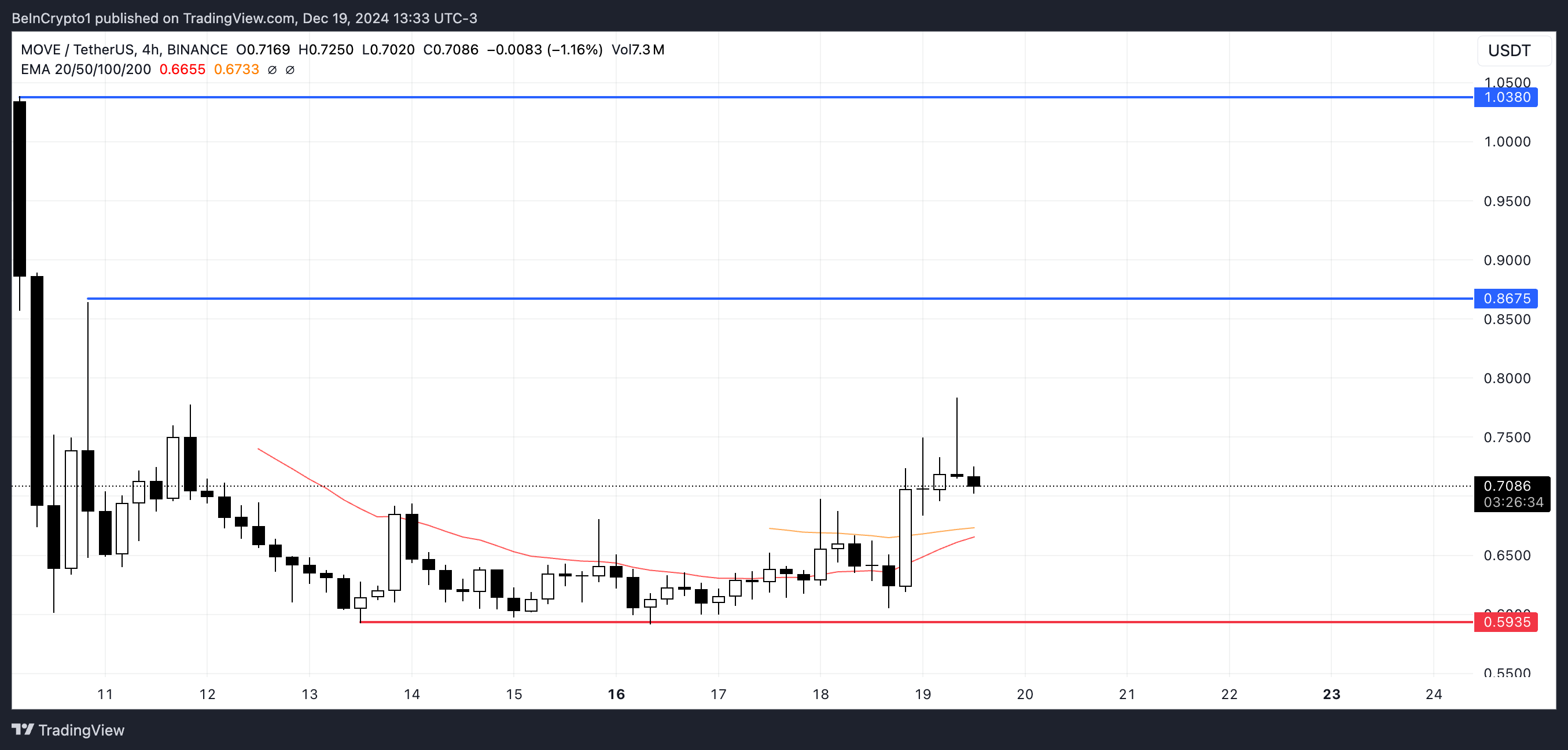 Movement đã được nhắc đến nhiều kể từ khi được niêm yết trên Binance khoảng một tuần trước. Nếu xu hướng tăng hiện tại tiếp tục, MOVE có khả năng kiểm tra mức kháng cự tại 0.86 USD trong ngắn hạn. Một sự bứt phá thành công trên mức này có thể mở đường cho những lợi nhuận tiếp theo, với các mục tiêu tại 1.03 USD và có thể là 1.10 USD, khiến nó trở thành một trong những Altcoin thú vị nhất cho tháng 12.