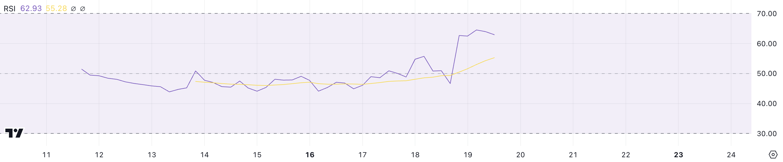 RSI (Chỉ số sức mạnh tương đối) đo lường tốc độ và mức độ thay đổi giá để đánh giá liệu một tài sản có bị mua quá mức hay bán quá mức. Các chỉ số trên 70 thường chỉ ra điều kiện mua quá mức, báo hiệu khả năng điều chỉnh, trong khi các chỉ số dưới 30 cho thấy điều kiện bán quá mức, thường báo trước một sự phục hồi.