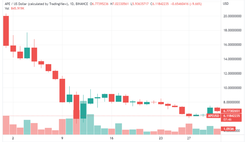 APE mở vào ngày 1 tháng 5 năm 2022, với giá giao dịch là 20.02 USD. Mã thông báo đạt mức thấp nhất tại 5.25 USD và kết thúc tháng ở mức 6.76 USD. Nhìn chung, đã có sự sụt giảm 66% giữa giá mở cửa và đóng cửa của APE trong tháng Năm.
