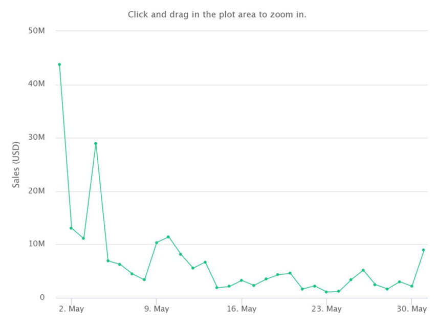 Theo đó, tổng doanh số bán hàng của BAYC cũng đã giảm mạnh vào tháng 5 năm 2022, chỉ thu về khoảng 214.91 triệu USD.